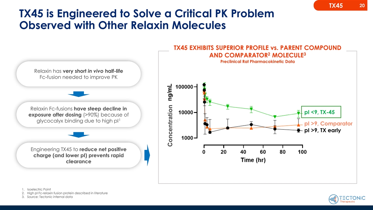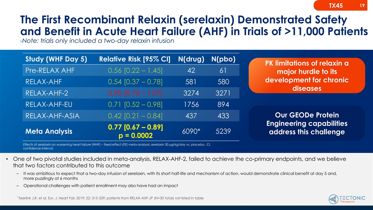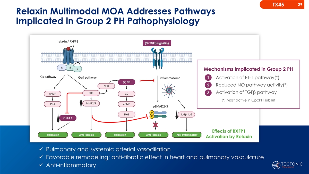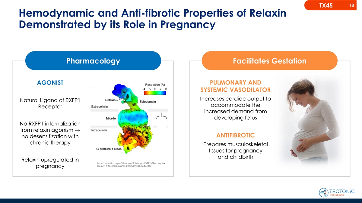 Tectonics lead program, TX000045 (TX45), is an Fc-relaxin fusion protein with optimized pharmacokinetics and biophysical properties that activates the RXFP1 receptor, the GPCR target of the hormone relaxin. Relaxin is an endogenous protein, expressed at low levels in both men and women. In normal human physiology, relaxin is upregulated during pregnancy where it exerts vasodilative effects, reduces systemic and pulmonary vascular resistance and increases cardiac output to accommodate the increased demand for oxygen and nutrients from the developing fetus. Relaxin also exerts anti-fibrotic effects on pelvic ligaments to facilitate delivery of the baby.