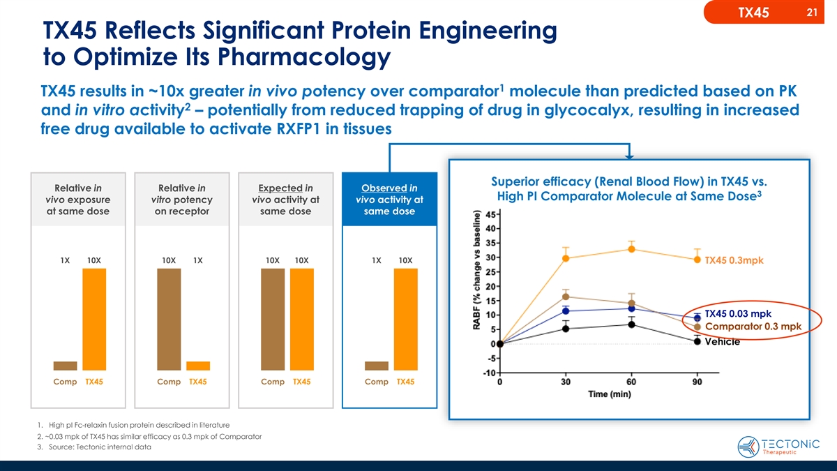 20 TX45 TX45 is Engineered to Solve a Critical PK Problem Observed with Other Relaxin Molecules TX45 EXHIBITS SUPERIOR PROFILE vs. PARENT COMPOUND 2 3 AND COMPARATOR MOLECULE Preclinical Rat Pharmacokinetic Data Relaxin has very short in vivo half-life Fc-fusion needed to improve PK Relaxin Fc-fusions have steep decline in pI <9, TX-45 exposure after dosing (>90%) because of 1 glycocalyx binding due to high pI pI >9, Comparator pI >9, TX early Engineering TX45 to reduce net positive charge (and lower pI) prevents rapid clearance 1. Isoelectric Point 2. High pI Fc-relaxin fusion protein described in literature 3. Source: Tectonic internal data Concentration
