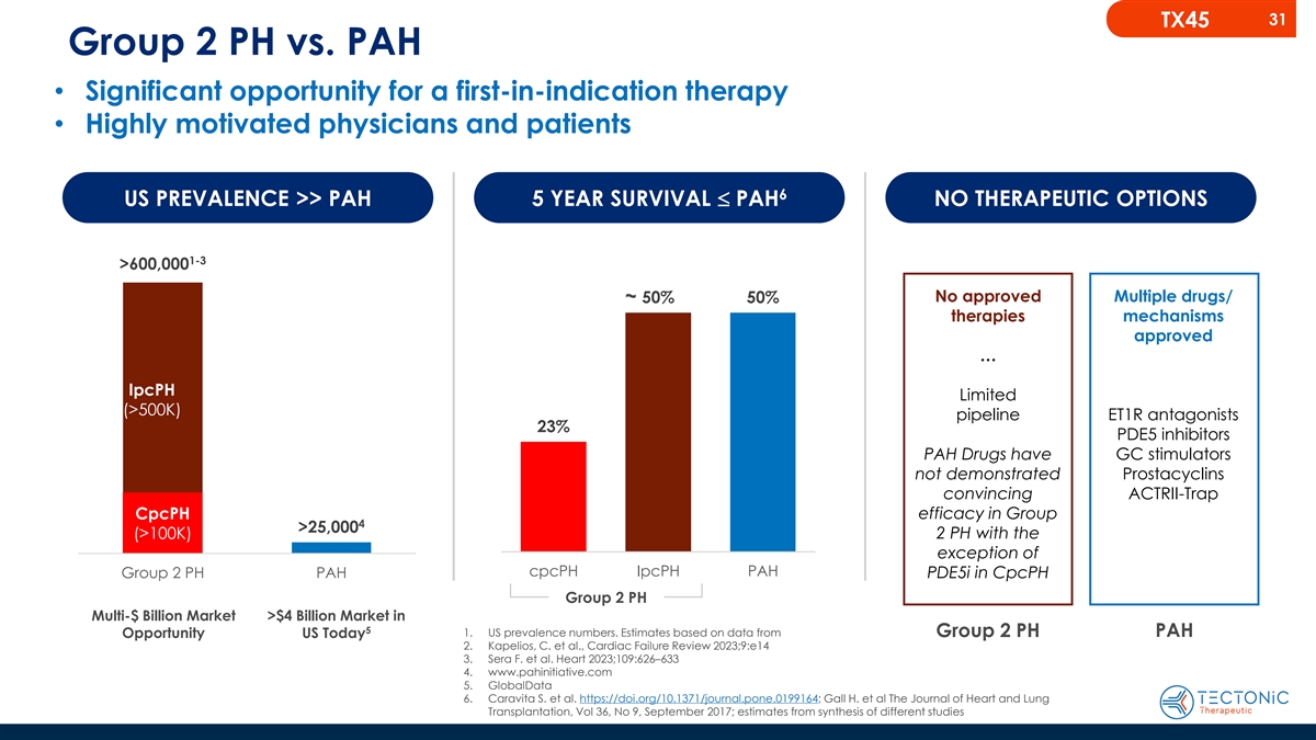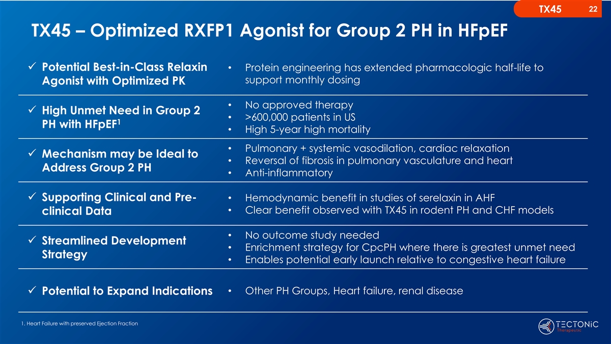 | | TX45 is an Fc-relaxin fusion protein being evaluated in patients with Group 2 Pulmonary Hypertension (PH) due to Heart Failure with Preserved Ejection Fraction (HFpEF), a serious condition estimated to affect over 600,000 people in the U.S. alone, currently with no approved therapies |