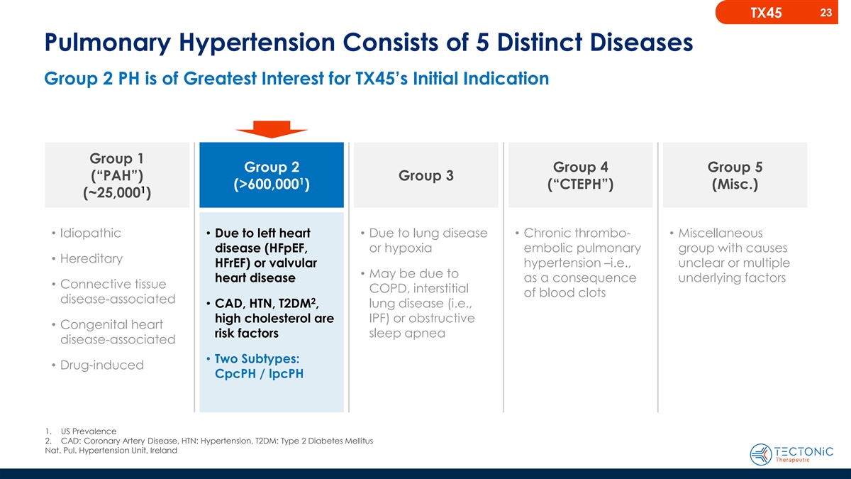 22 TX45 TX45 – Optimized RXFP1 Agonist for Group 2 PH in HFpEF ✓ Potential Best-in-Class Relaxin • Protein engineering has extended pharmacologic half-life to support monthly dosing Agonist with Optimized PK • No approved therapy ✓ High Unmet Need in Group 2 • >600,000 patients in US 1 PH with HFpEF • High 5-year high mortality • Pulmonary + systemic vasodilation, cardiac relaxation ✓ Mechanism may be Ideal to • Reversal of fibrosis in pulmonary vasculature and heart Address Group 2 PH • Anti-inflammatory ✓ Supporting Clinical and Pre-• Hemodynamic benefit in studies of serelaxin in AHF • Clear benefit observed with TX45 in rodent PH and CHF models clinical Data • No outcome study needed ✓ Streamlined Development • Enrichment strategy for CpcPH where there is greatest unmet need Strategy • Enables potential early launch relative to congestive heart failure • Other PH Groups, Heart failure, renal disease ✓ Potential to Expand Indications 1. Heart Failure with preserved Ejection Fraction