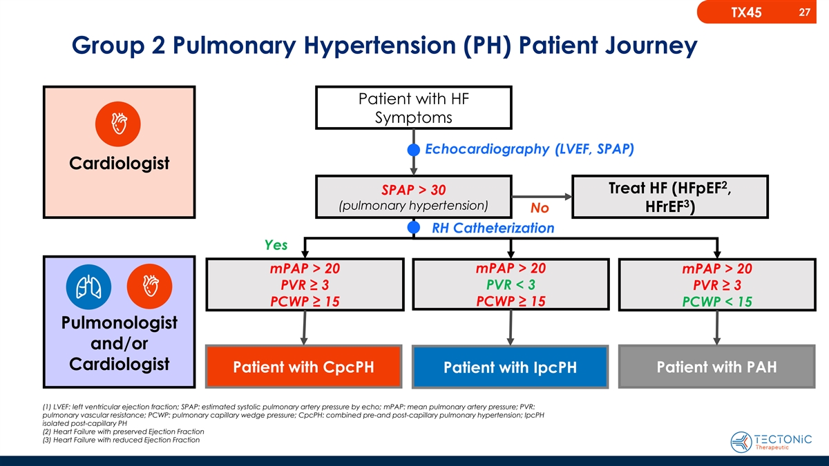 27 TX45 Group 2 Pulmonary Hypertension (PH) Patient Journey Patient with HF Symptoms Echocardiography (LVEF, SPAP) Cardiologist 2 Treat HF (HFpEF , SPAP > 30 3 (pulmonary hypertension) HFrEF ) No RH Catheterization Yes mPAP > 20 mPAP > 20 mPAP > 20 PVR ≥ 3 PVR < 3 PVR ≥ 3 PCWP ≥ 15 PCWP ≥ 15 PCWP < 15 Pulmonologist and/or Cardiologist Patient with CpcPH Patient with IpcPH Patient with PAH (1) LVEF: left ventricular ejection fraction; SPAP: estimated systolic pulmonary artery pressure by echo; mPAP: mean pulmonary artery pressure; PVR: pulmonary vascular resistance; PCWP: pulmonary capillary wedge pressure; CpcPH: combined pre-and post-capillary pulmonary hypertension; IpcPH isolated post-capillary PH (2) Heart Failure with preserved Ejection Fraction (3) Heart Failure with reduced Ejection Fraction