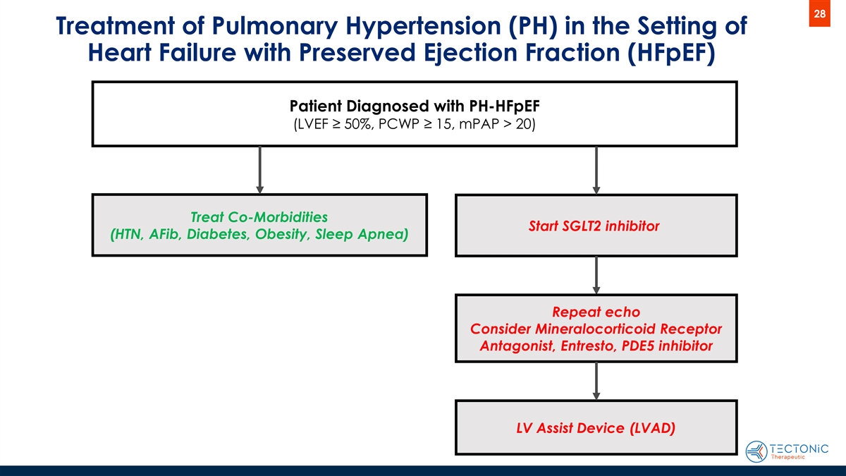 28 Treatment of Pulmonary Hypertension (PH) in the Setting of Heart Failure with Preserved Ejection Fraction (HFpEF) Patient Diagnosed with PH-HFpEF (LVEF ≥ 50%, PCWP ≥ 15, mPAP > 20) Treat Co-Morbidities Start SGLT2 inhibitor (HTN, AFib, Diabetes, Obesity, Sleep Apnea) Repeat echo Consider Mineralocorticoid Receptor Antagonist, Entresto, PDE5 inhibitor LV Assist Device (LVAD)