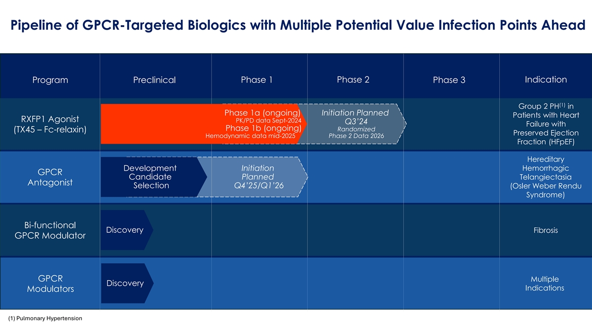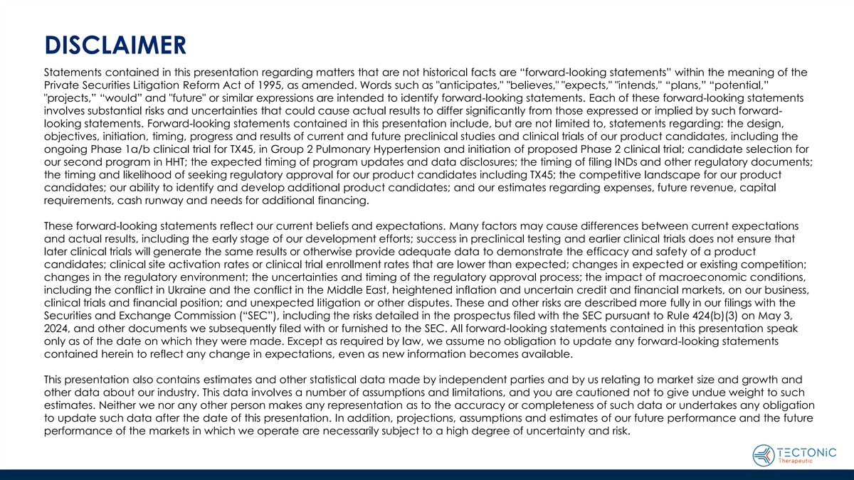 DISCLAIMER Statements contained in this presentation regarding matters that are not historical facts are “forward-looking statements” within the meaning of the Private Securities Litigation Reform Act of 1995, as amended. Words such as anticipates, believes, expects, intends, “plans,” “potential,” projects,” “would” and future or similar expressions are intended to identify forward-looking statements. Each of these forward-looking statements involves substantial risks and uncertainties that could cause actual results to differ significantly from those expressed or implied by such forward- looking statements. Forward-looking statements contained in this presentation include, but are not limited to, statements regarding: the design, objectives, initiation, timing, progress and results of current and future preclinical studies and clinical trials of our product candidates, including the ongoing Phase 1a/b clinical trial for TX45, in Group 2 Pulmonary Hypertension and initiation of proposed Phase 2 clinical trial; candidate selection for our second program in HHT; the expected timing of program updates and data disclosures; the timing of filing INDs and other regulatory documents; the timing and likelihood of seeking regulatory approval for our product candidates including TX45; the competitive landscape for our product candidates; our ability to identify and develop additional product candidates; and our estimates regarding expenses, future revenue, capital requirements, cash runway and needs for additional financing. These forward-looking statements reflect our current beliefs and expectations. Many factors may cause differences between current expectations and actual results, including the early stage of our development efforts; success in preclinical testing and earlier clinical trials does not ensure that later clinical trials will generate the same results or otherwise provide adequate data to demonstrate the efficacy and safety of a product candidates; clinical site activation rates or clinical trial enrollment rates that are lower than expected; changes in expected or existing competition; changes in the regulatory environment; the uncertainties and timing of the regulatory approval process; the impact of macroeconomic conditions, including the conflict in Ukraine and the conflict in the Middle East, heightened inflation and uncertain credit and financial markets, on our business, clinical trials and financial position; and unexpected litigation or other disputes. These and other risks are described more fully in our filings with the Securities and Exchange Commission (“SEC”), including the risks detailed in the prospectus filed with the SEC pursuant to Rule 424(b)(3) on May 3, 2024, and other documents we subsequently filed with or furnished to the SEC. All forward-looking statements contained in this presentation speak only as of the date on which they were made. Except as required by law, we assume no obligation to update any forward-looking statements contained herein to reflect any change in expectations, even as new information becomes available. This presentation also contains estimates and other statistical data made by independent parties and by us relating to market size and growth and other data about our industry. This data involves a number of assumptions and limitations, and you are cautioned not to give undue weight to such estimates. Neither we nor any other person makes any representation as to the accuracy or completeness of such data or undertakes any obligation to update such data after the date of this presentation. In addition, projections, assumptions and estimates of our future performance and the future performance of the markets in which we operate are necessarily subject to a high degree of uncertainty and risk.
