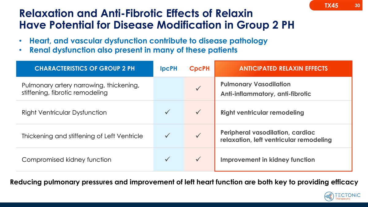 29 TX45 Relaxin Multimodal MOA Addresses Pathways Implicated in Group 2 PH Pathophysiology Mechanisms Implicated in Group 2 PH 1 Activation of ET-1 pathway(*) 2 Reduced NO pathway activity(*) Activation of TGFβ pathway 3 (*) Most active in CpcPH subset Effects of RXFP1 Activation by Relaxin ✓ Pulmonary and systemic arterial vasodilation ✓ Favorable remodeling: anti-fibrotic effect in heart and pulmonary vasculature ✓ Anti-inflammatory