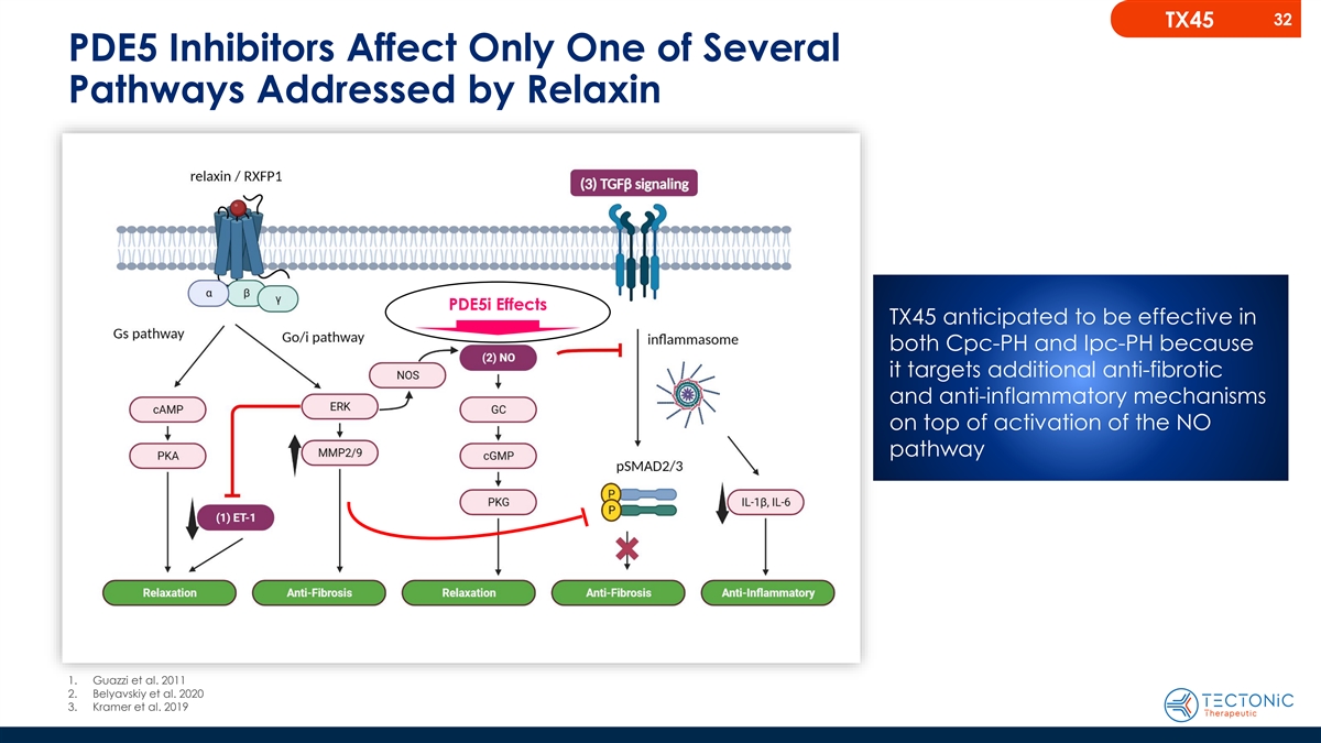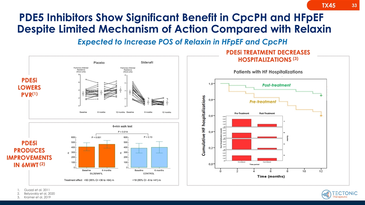 32 TX45 PDE5 Inhibitors Affect Only One of Several Pathways Addressed by Relaxin PDE5i Effects TX45 anticipated to be effective in both Cpc-PH and Ipc-PH because it targets additional anti-fibrotic and anti-inflammatory mechanisms on top of activation of the NO pathway 1. Guazzi et al. 2011 2. Belyavskiy et al. 2020 3. Kramer et al. 2019