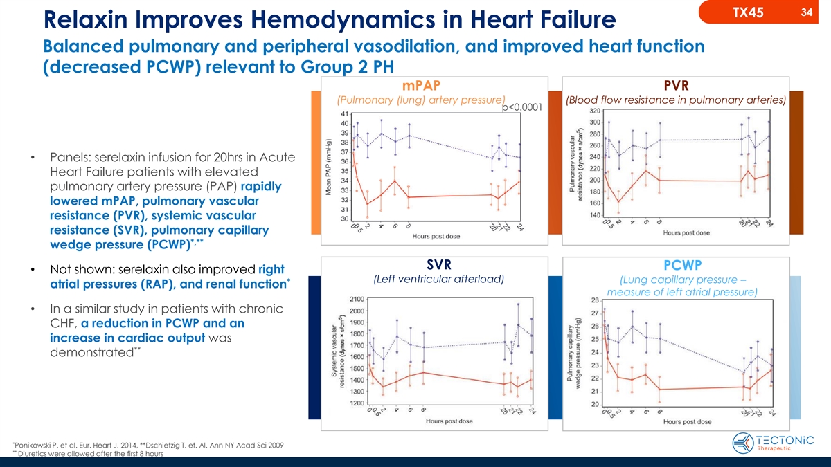 33 TX45 PDE5 Inhibitors Show Significant Benefit in CpcPH and HFpEF Despite Limited Mechanism of Action Compared with Relaxin Expected to Increase POS of Relaxin in HFpEF and CpcPH PDE5i TREATMENT DECREASES (3) HOSPITALIZATIONS Patients with HF Hospitalizations PDE5i Post-treatment LOWERS (1) PVR Pre-treatment PDE5i PRODUCES IMPROVEMENTS (2) IN 6MWT 1. Guazzi et al. 2011 2. Belyavskiy et al. 2020 3. Kramer et al. 2019