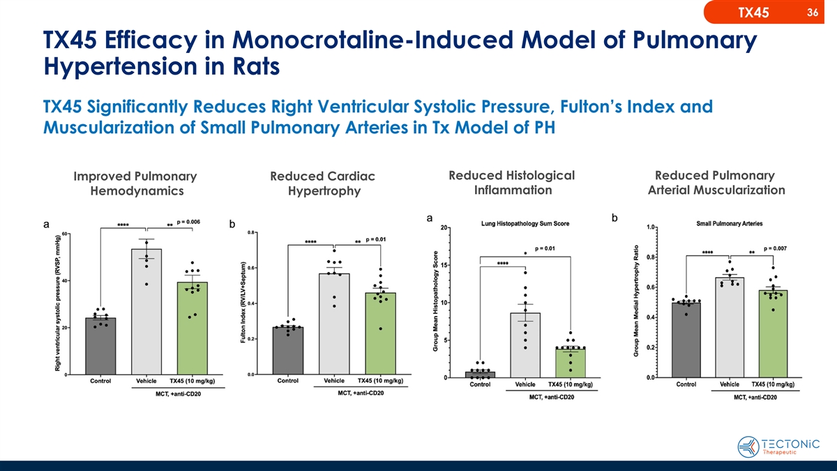 36 TX45 TX45 Efficacy in Monocrotaline-Induced Model of Pulmonary Hypertension in Rats TX45 Significantly Reduces Right Ventricular Systolic Pressure, Fulton’s Index and Muscularization of Small Pulmonary Arteries in Tx Model of PH Reduced Histological Reduced Pulmonary Improved Pulmonary Reduced Cardiac Inflammation Arterial Muscularization Hemodynamics Hypertrophy