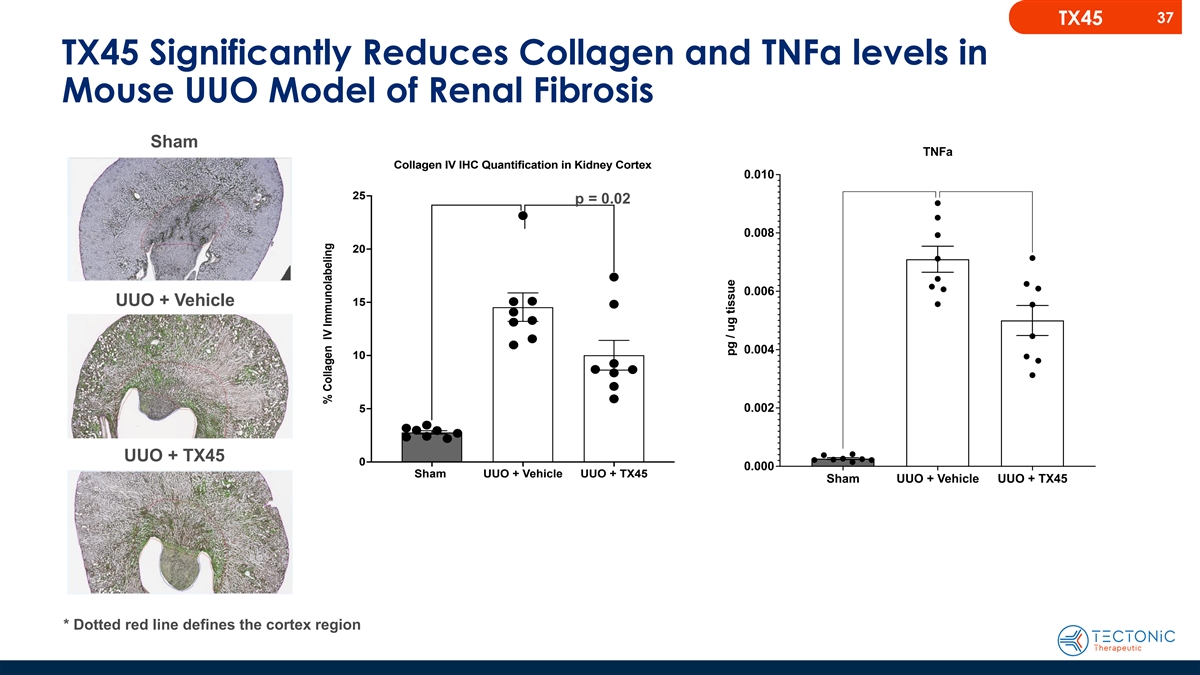 37 TX45 TX45 Significantly Reduces Collagen and TNFa levels in Mouse UUO Model of Renal Fibrosis Sham TNFa Collagen IV IHC Quantification in Kidney Cortex 0.010 25 p = 0.02 0.008 20 0.006 UUO + Vehicle 15 0.004 10 5 0.002 UUO + TX45 0 0.000 Sham UUO + Vehicle UUO + TX45 Sham UUO + Vehicle UUO + TX45 * Dotted red line defines the cortex region % Collagen IV Immunolabeling pg / ug tissue