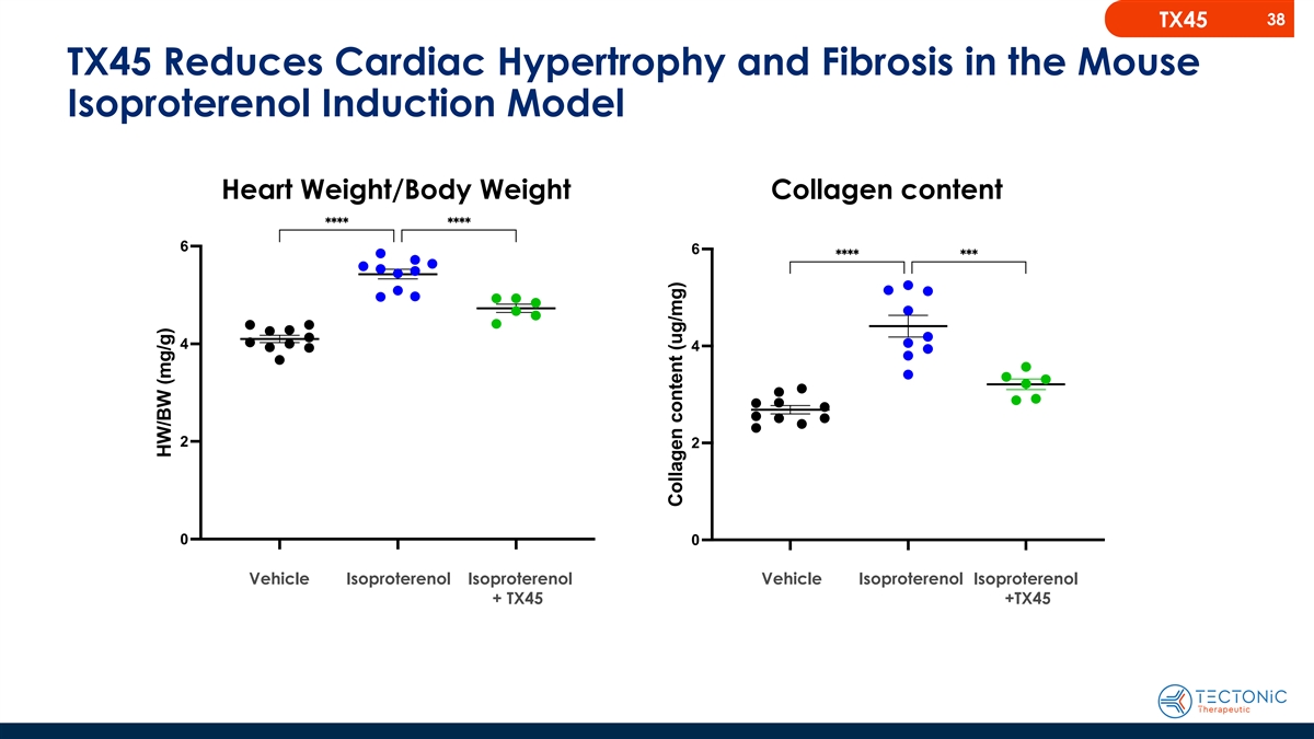 38 TX45 TX45 Reduces Cardiac Hypertrophy and Fibrosis in the Mouse Isoproterenol Induction Model Heart Weight/Body Weight Collagen content Vehicle Isoproterenol Isoproterenol Vehicle Isoproterenol Isoproterenol + TX45 +TX45