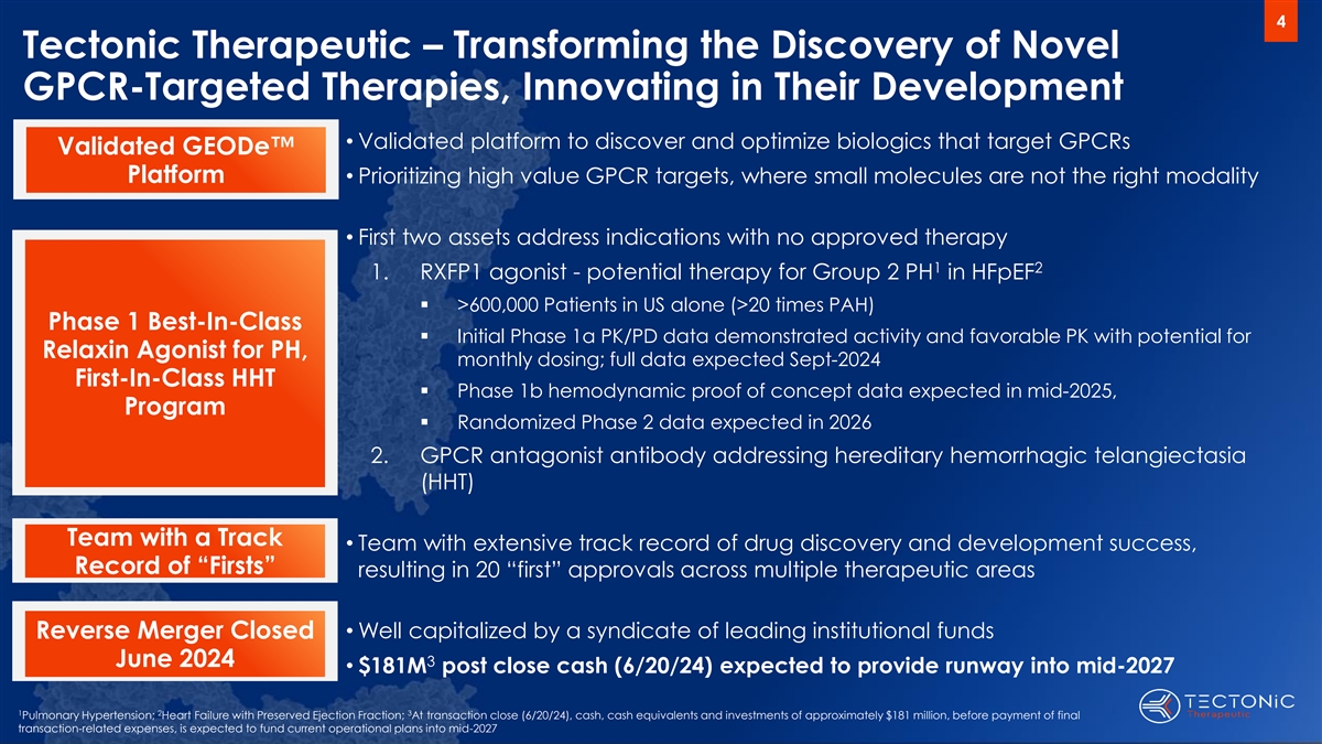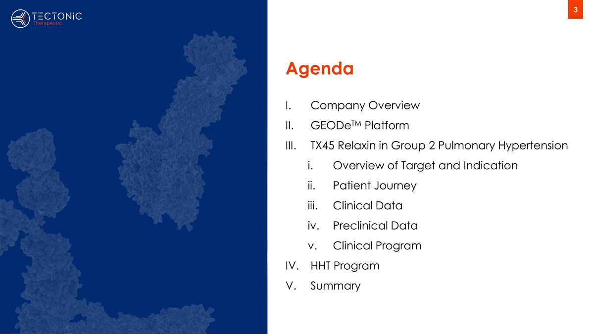 3 Agenda I. Company Overview TM II. GEODe Platform III. TX45 Relaxin in Group 2 Pulmonary Hypertension i. Overview of Target and Indication ii. Patient Journey iii. Clinical Data iv. Preclinical Data v. Clinical Program IV. HHT Program V. Summary