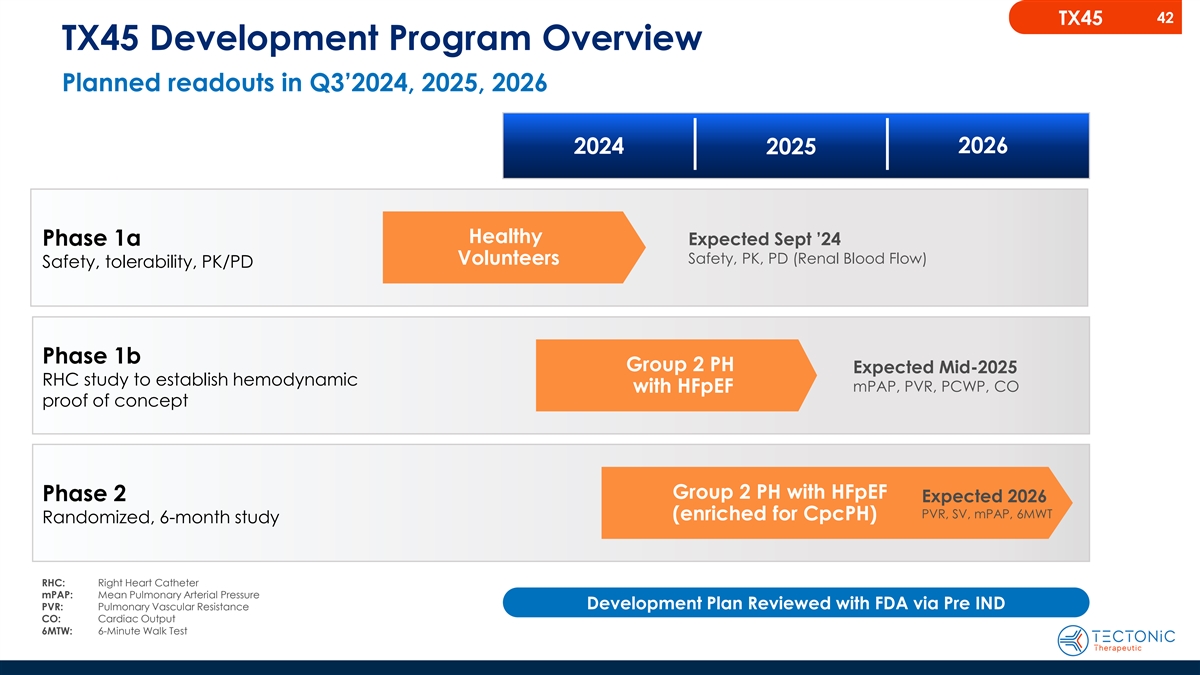 | | Planned initiation of global, 24-week Phase 2 clinical trial to evaluate TX45 administered subcutaneously in subjects with Group 2 PH due to HFpEF (PH-HFpEF) in the third quarter of 2024, with topline trial results expected in 2026 |
