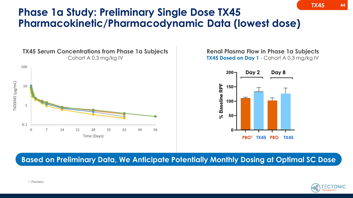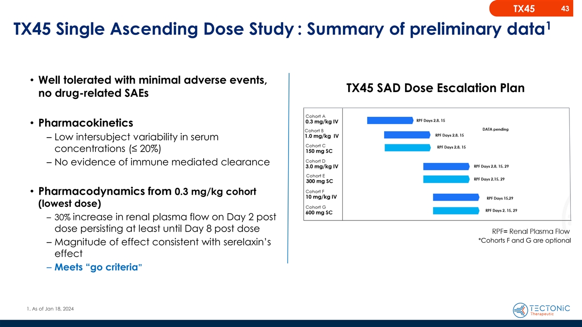 43 TX45 1 TX45 Single Ascending Dose Study : Summary of preliminary data • Well tolerated with minimal adverse events, TX45 SAD Dose Escalation Plan no drug-related SAEs • Pharmacokinetics – Low intersubject variability in serum concentrations (≤ 20%) – No evidence of immune mediated clearance • Pharmacodynamics from 0.3 mg/kg cohort (lowest dose) – 30% increase in renal plasma flow on Day 2 post dose persisting at least until Day 8 post dose *Cohorts F and G are optional – Magnitude of effect consistent with serelaxin’s effect – Meets “go criteria” 1. As of Jan 18, 2024