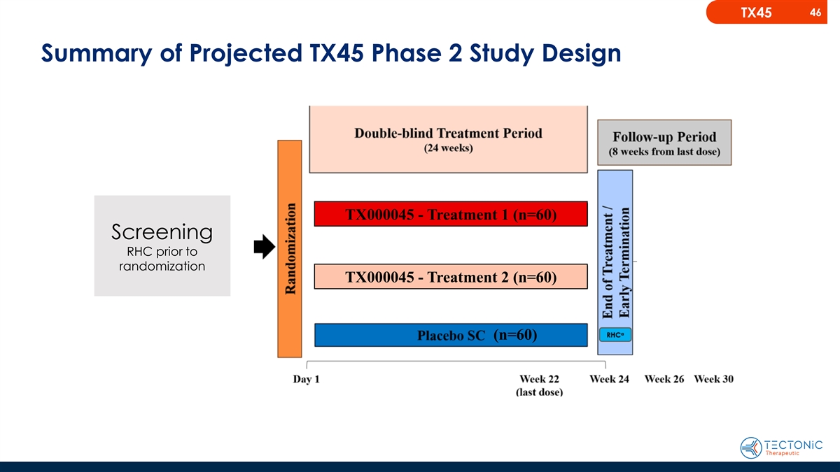 Tectonic expects to initiate the global Phase 2 clinical trial of TX45 in PH-HFpEF in the third quarter of 2024, with topline results anticipated in 2026. The trial is designed to evaluate efficacy in the broad PH-HFpEF population and enrich for the subset of Group 2 PH patients with a more severe form of disease known as combined post and precapillary pulmonary hypertension (CpcPH) defined by baseline pulmonary vascular resistance (PVR) of greater than 3 Wood units. The trial plans to enroll up to 180 subjects who will be randomized to one of two dose regimens of TX45 or placebo. TX45 will be administered by subcutaneous (SC) injection for 24-weeks followed by an 8-week follow-up period. The primary and secondary endpoints of the trial include change from baseline in PVR as well as other relevant hemodynamic changes. It will also explore TX45s effect on change in six-minute walk distance.