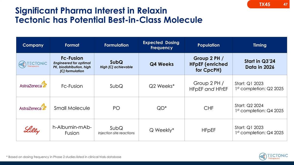 47 TX45 Significant Pharma Interest in Relaxin Tectonic has Potential Best-in-Class Molecule Expected Dosing Company Format Formulation Population Timing Frequency Fc-Fusion Group 2 PH / Start in Q3’24 SubQ Engineered for optimal Q4 Weeks HFpEF (enriched PK, biodistribution, high High [C] achievable Data in 2026 for CpcPH) [C] formulation Group 2 PH / Start: Q1 2023 Fc-Fusion SubQ Q2 Weeks* st 1 completion: Q2 2025 HFpEF and HFrEF Start: Q2 2024 Small Molecule PO QD* CHF st 1 completion: Q4 2025 h-Albumin-mAb- Start: Q1 2023 SubQ Q Weekly* HFpEF st Injection site reactions 1 completion: Q4 2025 Fusion * Based on dosing frequency in Phase 2 studies listed in clinical trials database