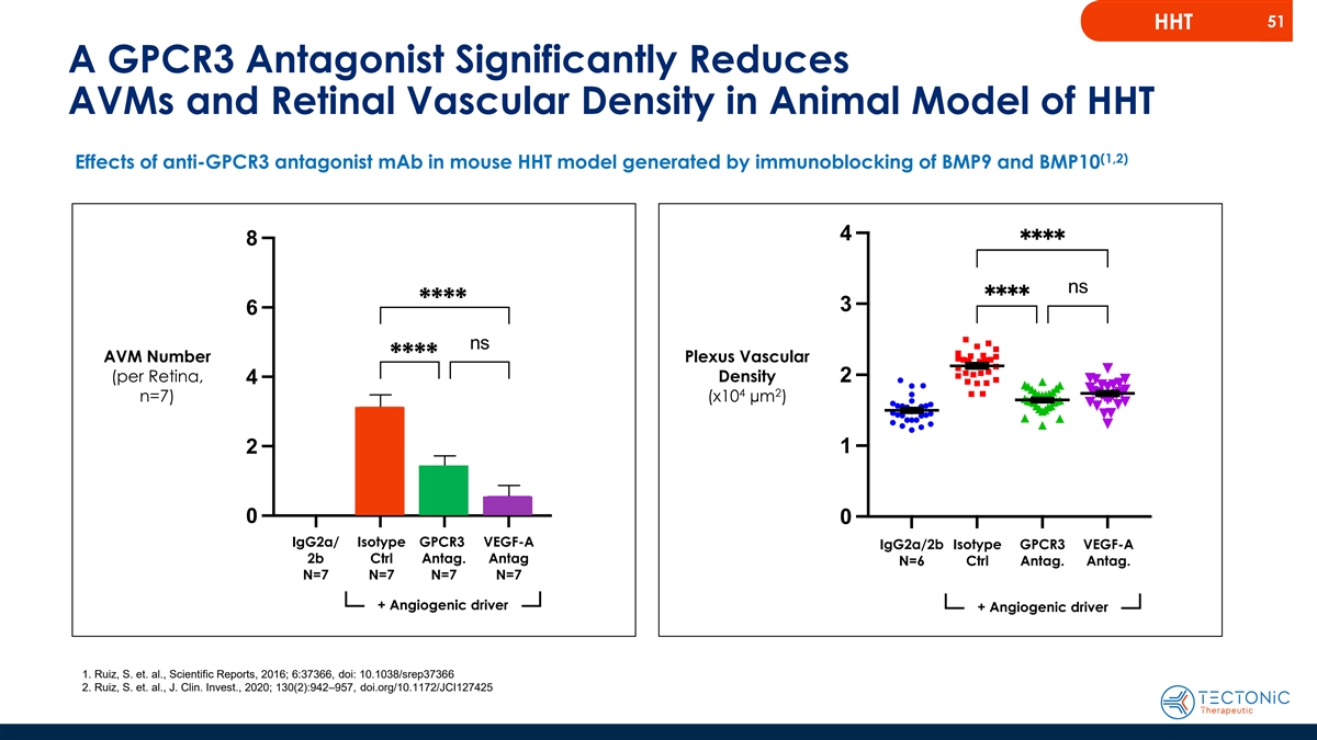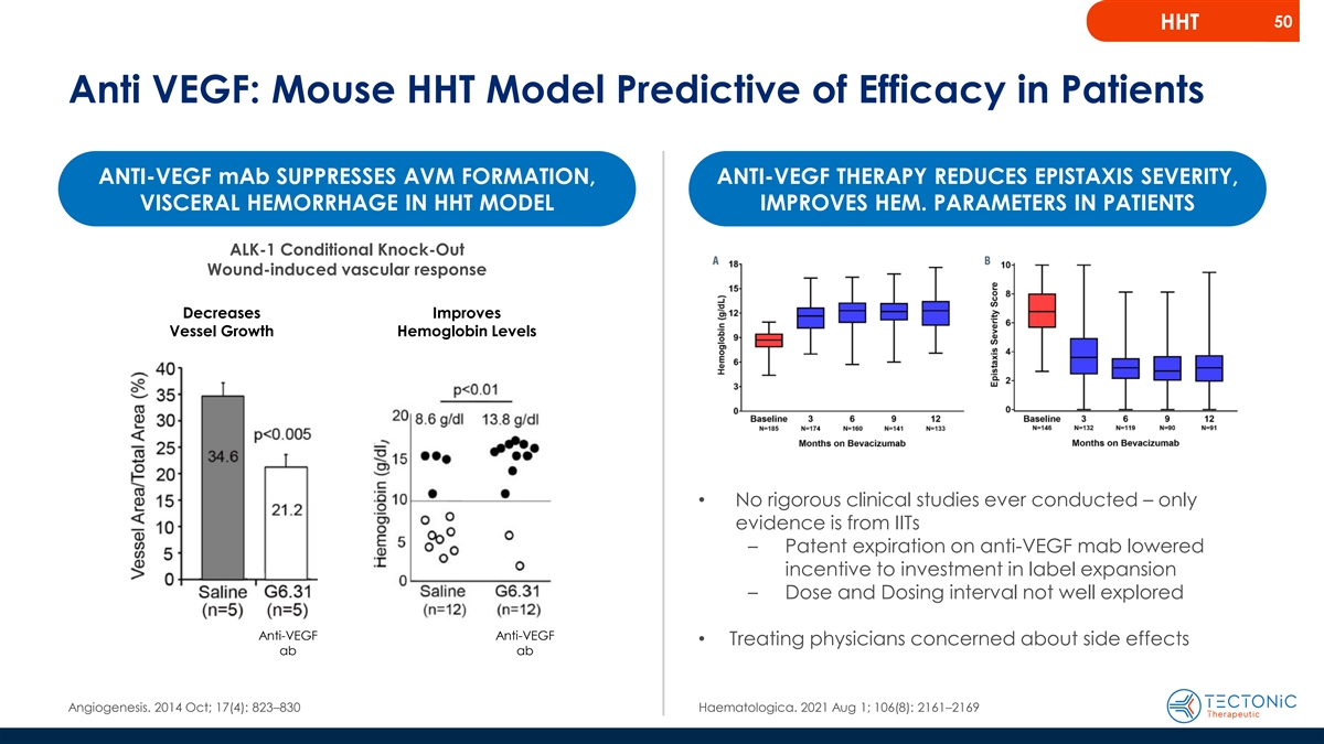50 HHT Anti VEGF: Mouse HHT Model Predictive of Efficacy in Patients ANTI-VEGF mAb SUPPRESSES AVM FORMATION, ANTI-VEGF THERAPY REDUCES EPISTAXIS SEVERITY, VISCERAL HEMORRHAGE IN HHT MODEL IMPROVES HEM. PARAMETERS IN PATIENTS ALK-1 Conditional Knock-Out Wound-induced vascular response Decreases Improves Vessel Growth Hemoglobin Levels Incisional wounds • No rigorous clinical studies ever conducted – only evidence is from IITs – Patent expiration on anti-VEGF mab lowered incentive to investment in label expansion – Dose and Dosing interval not well explored Anti-VEGF Anti-VEGF • Treating physicians concerned about side effects ab ab Angiogenesis. 2014 Oct; 17(4): 823–830 Haematologica. 2021 Aug 1; 106(8): 2161–2169