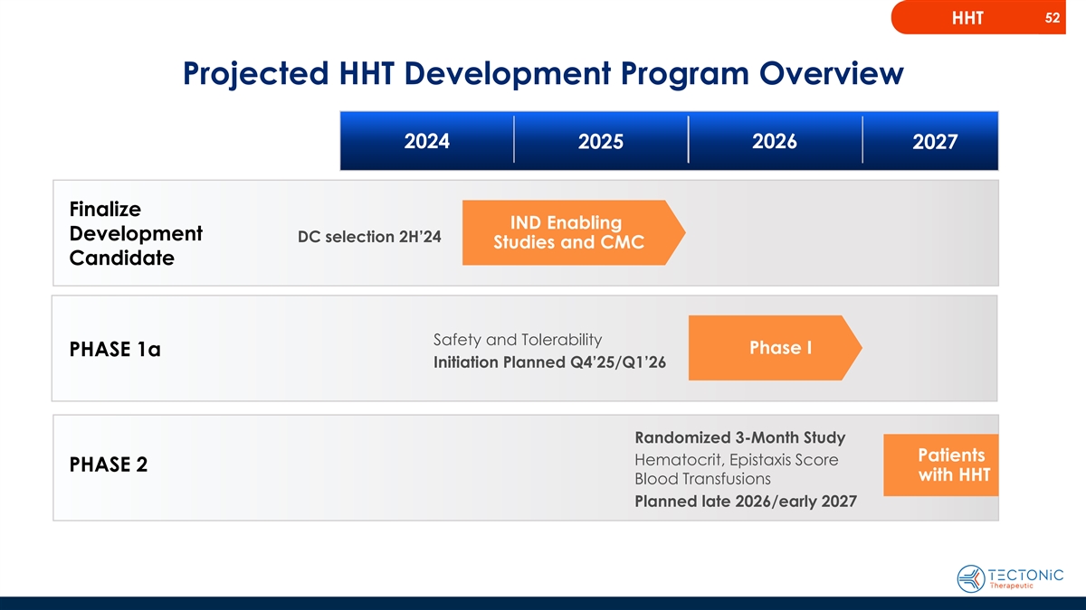 52 HHT Projected HHT Development Program Overview 2024 2026 2025 2027 Finalize IND Enabling Development DC selection 2H’24 Studies and CMC Candidate Safety and Tolerability Phase I PHASE 1a Initiation Planned Q4’25/Q1’26 Randomized 3-Month Study Patients Hematocrit, Epistaxis Score PHASE 2 with HHT Blood Transfusions Planned late 2026/early 2027