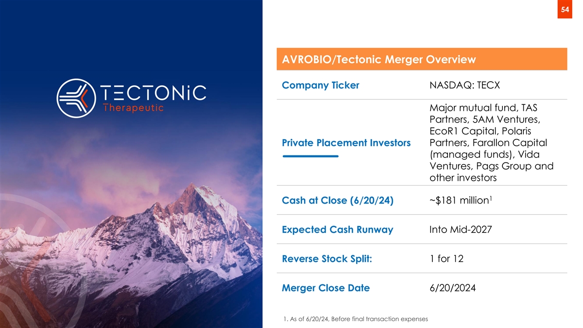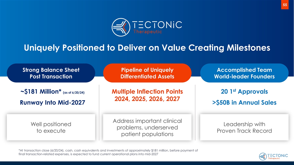 54 AVROBIO/Tectonic Merger Overview Company Ticker NASDAQ: TECX Major mutual fund, TAS Partners, 5AM Ventures, EcoR1 Capital, Polaris Private Placement Investors Partners, Farallon Capital (managed funds), Vida Ventures, Pags Group and other investors 1 ~$181 million Cash at Close (6/20/24) Into Mid-2027 Expected Cash Runway Reverse Stock Split: 1 for 12 Merger Close Date 6/20/2024 1. As of 6/20/24, Before final transaction expenses