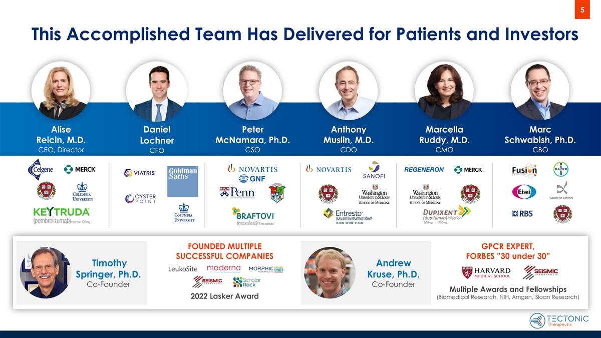 4 Tectonic Therapeutic – Transforming the Discovery of Novel GPCR-Targeted Therapies, Innovating in Their Development • Validated platform to discover and optimize biologics that target GPCRs Validated GEODe Platform• Prioritizing high value GPCR targets, where small molecules are not the right modality • First two assets address indications with no approved therapy 1 2 1. RXFP1 agonist - potential therapy for Group 2 PH in HFpEF ▪ >600,000 Patients in US alone (>20 times PAH) Phase 1 Best-In-Class ▪ Initial Phase 1a PK/PD data demonstrated activity and favorable PK with potential for Relaxin Agonist for PH, monthly dosing; full data expected Sept-2024 First-In-Class HHT ▪ Phase 1b hemodynamic proof of concept data expected in mid-2025, Program ▪ Randomized Phase 2 data expected in 2026 2. GPCR antagonist antibody addressing hereditary hemorrhagic telangiectasia (HHT) Team with a Track • Team with extensive track record of drug discovery and development success, Record of “Firsts” resulting in 20 “first” approvals across multiple therapeutic areas • Well capitalized by a syndicate of leading institutional funds Reverse Merger Closed June 2024 3 • $181M post close cash (6/20/24) expected to provide runway into mid-2027 1 2 3 Pulmonary Hypertension; Heart Failure with Preserved Ejection Fraction; At transaction close (6/20/24), cash, cash equivalents and investments of approximately $181 million, before payment of final transaction-related expenses, is expected to fund current operational plans into mid-2027