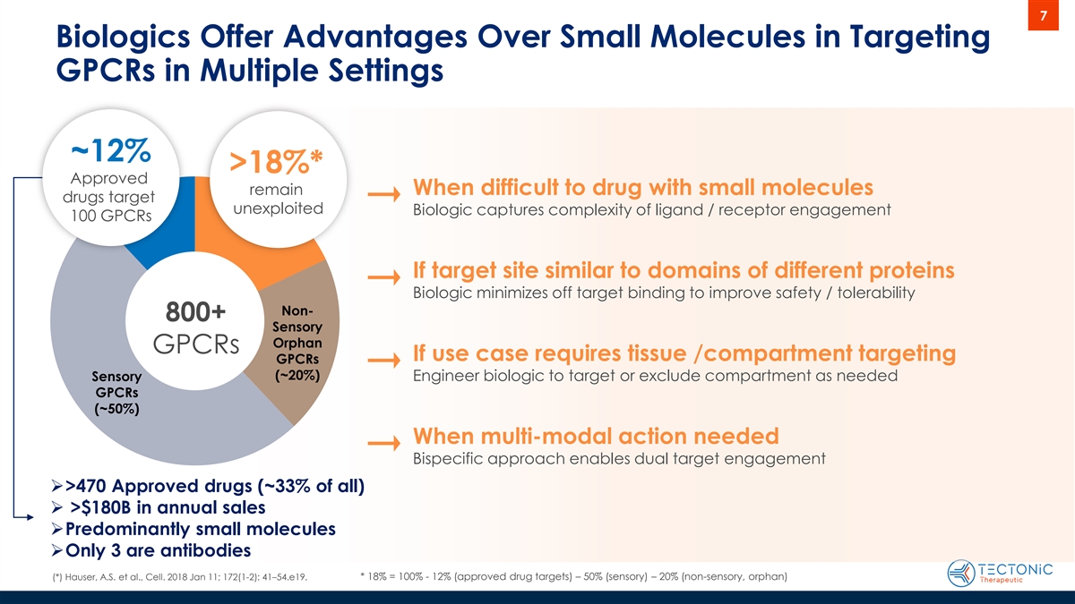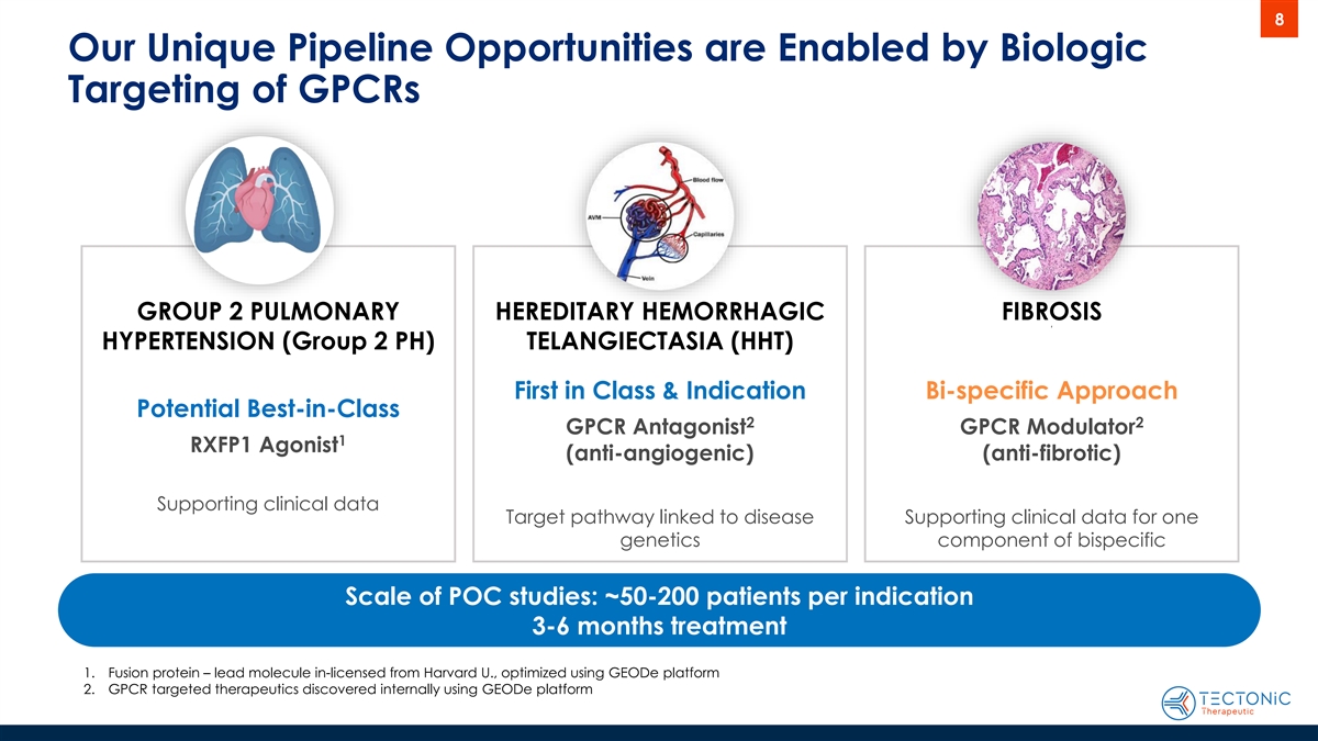 7 Biologics Offer Advantages Over Small Molecules in Targeting GPCRs in Multiple Settings ~12% >18%* Approved remain When difficult to drug with small molecules drugs target unexploited Biologic captures complexity of ligand / receptor engagement 100 GPCRs If target site similar to domains of different proteins Biologic minimizes off target binding to improve safety / tolerability Non- 800+ Sensory Orphan GPCRs If use case requires tissue /compartment targeting GPCRs (~20%) Sensory Engineer biologic to target or exclude compartment as needed GPCRs (~50%) When multi-modal action needed Bispecific approach enables dual target engagement ➢>470 Approved drugs (~33% of all) ➢ >$180B in annual sales ➢Predominantly small molecules ➢Only 3 are antibodies (*) Hauser, A.S. et al., Cell. 2018 Jan 11; 172(1-2): 41–54.e19. * 18% = 100% - 12% (approved drug targets) – 50% (sensory) – 20% (non-sensory, orphan)