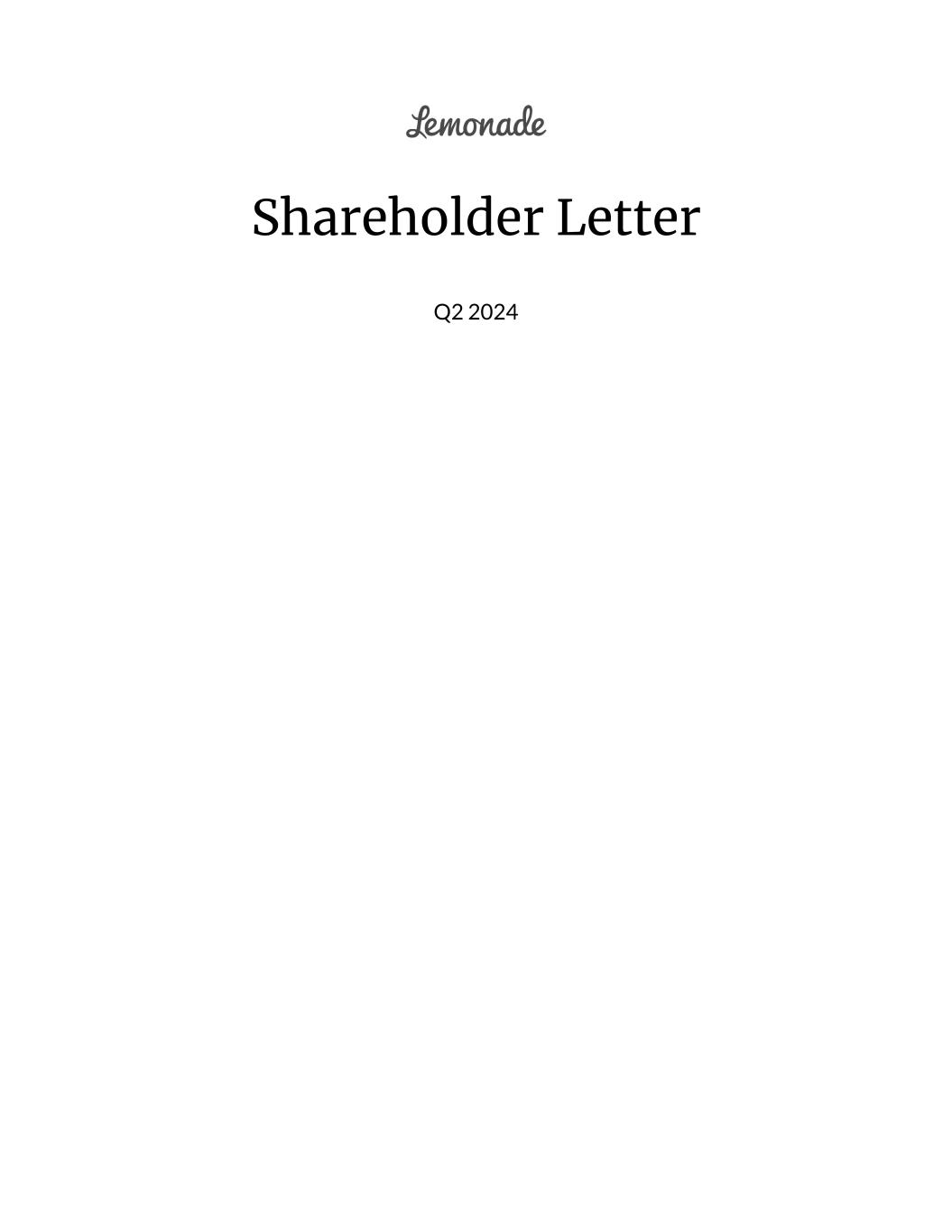 Links The information contained on, or that can be accessed through, hyperlinks included herein is deemed not to be incorporated in or part of this shareholder letter. Earnings teleconference information The Company will discuss its second quarter 2024 financial results and business outlook during a teleconference on July 31, 2024, at 8:00 AM ET. The conference call (access code 253964) can be accessed toll-free at 1-833-470-1428, or at 1-404-975-4839. A live audio webcast of the call will also be available simultaneously at https:// investor.lemonade.com Following completion of the call, a recorded replay of the webcast will be available on the investor relations section of Lemonade’s website. Additional investor information can be accessed at https://investor.lemonade.com About Lemonade Lemonade offers renters, homeowners, pet, car, and life insurance. Powered by artificial intelligence and behavioral economics, Lemonade’s full stack insurance carriers in the US, the UK and the EU replace brokers and bureaucracy with bots and machine learning, aiming for zero paperwork and instant everything. A Certified B-Corp, Lemonade donates to nonprofits selected by its community, during its annual Giveback. Lemonade is currently available in the United States, the UK, Germany, the Netherlands, and France, and continues to expand globally. For more information, please visit www.lemonade.com, and follow Lemonade on X or Instagram. Media inquiries: press@lemonade.com Investor contact: ir@lemonade.com 19
