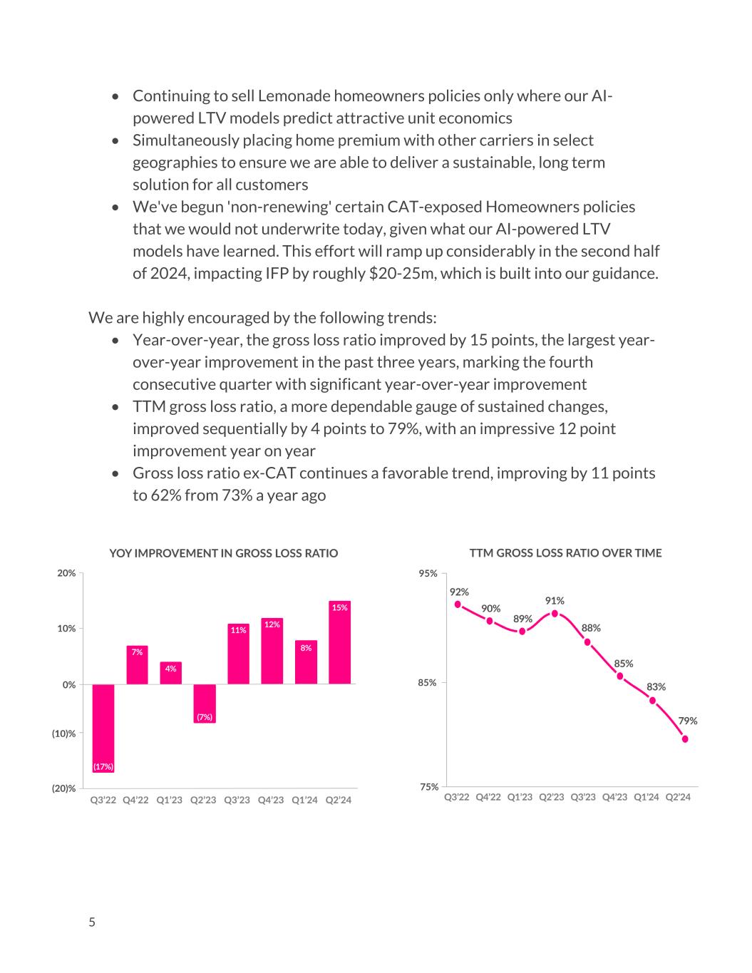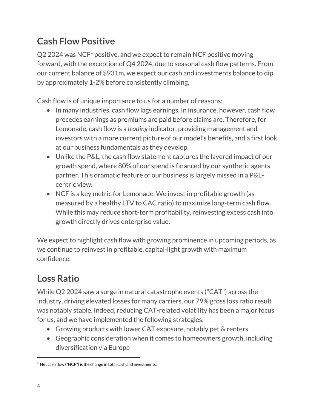 4 1 Net cash flow ("NCF") is the change in total cash and investments. Cash Flow Positive Q2 2024 was NCF1 positive, and we expect to remain NCF positive moving forward, with the exception of Q4 2024, due to seasonal cash flow patterns. From our current balance of $931m, we expect our cash and investments balance to dip by approximately 1-2% before consistently climbing. Cash flow is of unique importance to us for a number of reasons: • In many industries, cash flow lags earnings. In insurance, however, cash flow precedes earnings as premiums are paid before claims are. Therefore, for Lemonade, cash flow is a leading indicator, providing management and investors with a more current picture of our model's benefits, and a first look at our business fundamentals as they develop. • Unlike the P&L, the cash flow statement captures the layered impact of our growth spend, where 80% of our spend is financed by our synthetic agents partner. This dramatic feature of our business is largely missed in a P&L- centric view. • NCF is a key metric for Lemonade. We invest in profitable growth (as measured by a healthy LTV to CAC ratio) to maximize long-term cash flow. While this may reduce short-term profitability, reinvesting excess cash into growth directly drives enterprise value. We expect to highlight cash flow with growing prominence in upcoming periods, as we continue to reinvest in profitable, capital-light growth with maximum confidence. Loss Ratio While Q2 2024 saw a surge in natural catastrophe events ("CAT") across the industry, driving elevated losses for many carriers, our 79% gross loss ratio result was notably stable. Indeed, reducing CAT-related volatility has been a major focus for us, and we have implemented the following strategies: • Growing products with lower CAT exposure, notably pet & renters • Geographic consideration when it comes to homeowners growth, including diversification via Europe