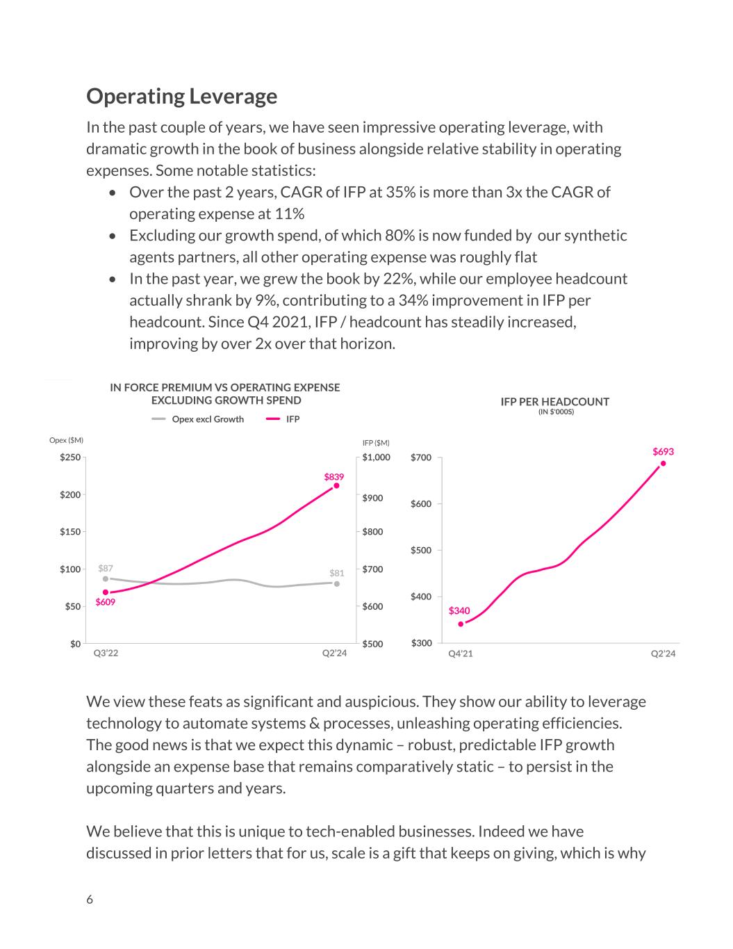 Operating Leverage In the past couple of years, we have seen impressive operating leverage, with dramatic growth in the book of business alongside relative stability in operating expenses. Some notable statistics: • Over the past 2 years, CAGR of IFP at 35% is more than 3x the CAGR of operating expense at 11% • Excluding our growth spend, of which 80% is now funded by our synthetic agents partners, all other operating expense was roughly flat • In the past year, we grew the book by 22%, while our employee headcount actually shrank by 9%, contributing to a 34% improvement in IFP per headcount. Since Q4 2021, IFP / headcount has steadily increased, improving by over 2x over that horizon. We view these feats as significant and auspicious. They show our ability to leverage technology to automate systems & processes, unleashing operating efficiencies. The good news is that we expect this dynamic – robust, predictable IFP growth alongside an expense base that remains comparatively static – to persist in the upcoming quarters and years. We believe that this is unique to tech-enabled businesses. Indeed we have discussed in prior letters that for us, scale is a gift that keeps on giving, which is why 6