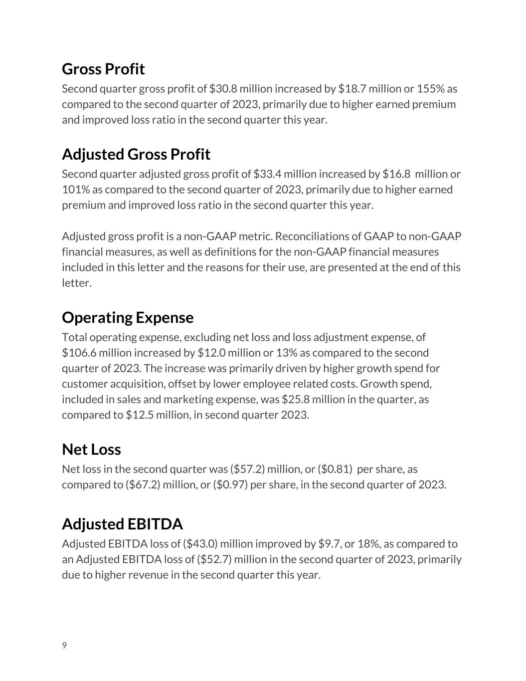 Gross Profit Second quarter gross profit of $30.8 million increased by $18.7 million or 155% as compared to the second quarter of 2023, primarily due to higher earned premium and improved loss ratio in the second quarter this year. Adjusted Gross Profit Second quarter adjusted gross profit of $33.4 million increased by $16.8 million or 101% as compared to the second quarter of 2023, primarily due to higher earned premium and improved loss ratio in the second quarter this year. Adjusted gross profit is a non-GAAP metric. Reconciliations of GAAP to non-GAAP financial measures, as well as definitions for the non-GAAP financial measures included in this letter and the reasons for their use, are presented at the end of this letter. Operating Expense Total operating expense, excluding net loss and loss adjustment expense, of $106.6 million increased by $12.0 million or 13% as compared to the second quarter of 2023. The increase was primarily driven by higher growth spend for customer acquisition, offset by lower employee related costs. Growth spend, included in sales and marketing expense, was $25.8 million in the quarter, as compared to $12.5 million, in second quarter 2023. Net Loss Net loss in the second quarter was ($57.2) million, or ($0.81) per share, as compared to ($67.2) million, or ($0.97) per share, in the second quarter of 2023. Adjusted EBITDA Adjusted EBITDA loss of ($43.0) million improved by $9.7, or 18%, as compared to an Adjusted EBITDA loss of ($52.7) million in the second quarter of 2023, primarily due to higher revenue in the second quarter this year. 9