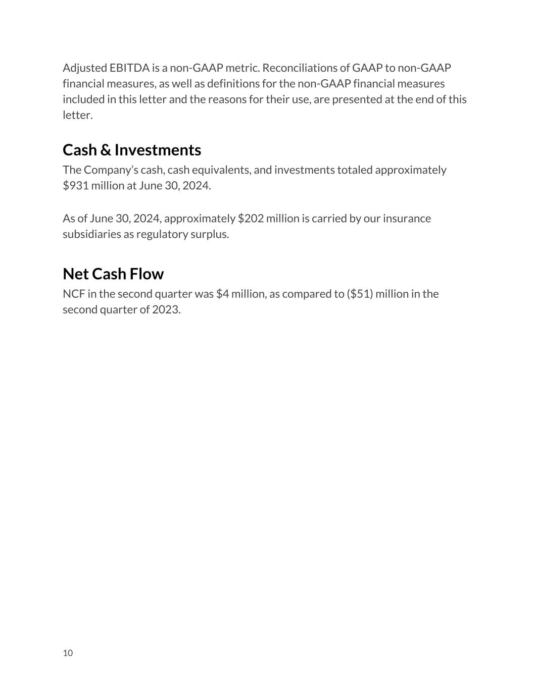 Adjusted EBITDA is a non-GAAP metric. Reconciliations of GAAP to non-GAAP financial measures, as well as definitions for the non-GAAP financial measures included in this letter and the reasons for their use, are presented at the end of this letter. Cash & Investments The Company’s cash, cash equivalents, and investments totaled approximately $931 million at June 30, 2024. As of June 30, 2024, approximately $202 million is carried by our insurance subsidiaries as regulatory surplus. Net Cash Flow NCF in the second quarter was $4 million, as compared to ($51) million in the second quarter of 2023. 10