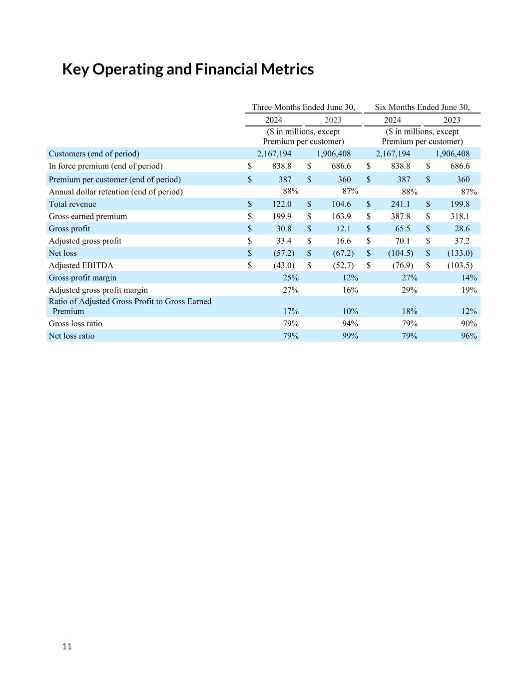 Key Operating and Financial Metrics Three Months Ended June 30, Six Months Ended June 30, 2024 2023 2024 2023 ($ in millions, except Premium per customer) ($ in millions, except Premium per customer) Customers (end of period) 2,167,194 1,906,408 2,167,194 1,906,408 In force premium (end of period) $ 838.8 $ 686.6 $ 838.8 $ 686.6 Premium per customer (end of period) $ 387 $ 360 $ 387 $ 360 Annual dollar retention (end of period) 88% 87% 88% 87% Total revenue $ 122.0 $ 104.6 $ 241.1 $ 199.8 Gross earned premium $ 199.9 $ 163.9 $ 387.8 $ 318.1 Gross profit $ 30.8 $ 12.1 $ 65.5 $ 28.6 Adjusted gross profit $ 33.4 $ 16.6 $ 70.1 $ 37.2 Net loss $ (57.2) $ (67.2) $ (104.5) $ (133.0) Adjusted EBITDA $ (43.0) $ (52.7) $ (76.9) $ (103.5) Gross profit margin 25% 12% 27% 14% Adjusted gross profit margin 27% 16% 29% 19% Ratio of Adjusted Gross Profit to Gross Earned Premium 17% 10% 18% 12% Gross loss ratio 79% 94% 79% 90% Net loss ratio 79% 99% 79% 96% 11