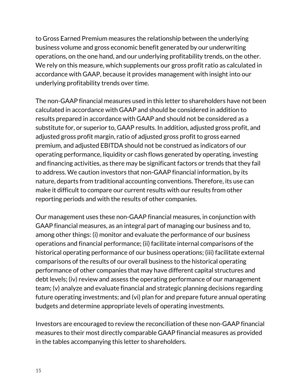 to Gross Earned Premium measures the relationship between the underlying business volume and gross economic benefit generated by our underwriting operations, on the one hand, and our underlying profitability trends, on the other. We rely on this measure, which supplements our gross profit ratio as calculated in accordance with GAAP, because it provides management with insight into our underlying profitability trends over time. The non-GAAP financial measures used in this letter to shareholders have not been calculated in accordance with GAAP and should be considered in addition to results prepared in accordance with GAAP and should not be considered as a substitute for, or superior to, GAAP results. In addition, adjusted gross profit, and adjusted gross profit margin, ratio of adjusted gross profit to gross earned premium, and adjusted EBITDA should not be construed as indicators of our operating performance, liquidity or cash flows generated by operating, investing and financing activities, as there may be significant factors or trends that they fail to address. We caution investors that non-GAAP financial information, by its nature, departs from traditional accounting conventions. Therefore, its use can make it difficult to compare our current results with our results from other reporting periods and with the results of other companies. Our management uses these non-GAAP financial measures, in conjunction with GAAP financial measures, as an integral part of managing our business and to, among other things: (i) monitor and evaluate the performance of our business operations and financial performance; (ii) facilitate internal comparisons of the historical operating performance of our business operations; (iii) facilitate external comparisons of the results of our overall business to the historical operating performance of other companies that may have different capital structures and debt levels; (iv) review and assess the operating performance of our management team; (v) analyze and evaluate financial and strategic planning decisions regarding future operating investments; and (vi) plan for and prepare future annual operating budgets and determine appropriate levels of operating investments. Investors are encouraged to review the reconciliation of these non-GAAP financial measures to their most directly comparable GAAP financial measures as provided in the tables accompanying this letter to shareholders. 15