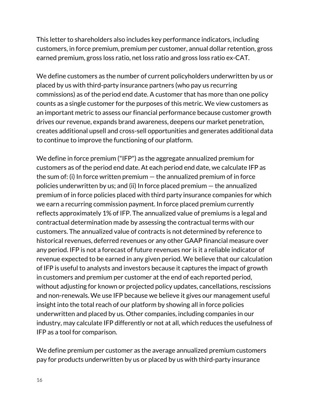 This letter to shareholders also includes key performance indicators, including customers, in force premium, premium per customer, annual dollar retention, gross earned premium, gross loss ratio, net loss ratio and gross loss ratio ex-CAT. We define customers as the number of current policyholders underwritten by us or placed by us with third-party insurance partners (who pay us recurring commissions) as of the period end date. A customer that has more than one policy counts as a single customer for the purposes of this metric. We view customers as an important metric to assess our financial performance because customer growth drives our revenue, expands brand awareness, deepens our market penetration, creates additional upsell and cross-sell opportunities and generates additional data to continue to improve the functioning of our platform. We define in force premium ("IFP") as the aggregate annualized premium for customers as of the period end date. At each period end date, we calculate IFP as the sum of: (i) In force written premium — the annualized premium of in force policies underwritten by us; and (ii) In force placed premium — the annualized premium of in force policies placed with third party insurance companies for which we earn a recurring commission payment. In force placed premium currently reflects approximately 1% of IFP. The annualized value of premiums is a legal and contractual determination made by assessing the contractual terms with our customers. The annualized value of contracts is not determined by reference to historical revenues, deferred revenues or any other GAAP financial measure over any period. IFP is not a forecast of future revenues nor is it a reliable indicator of revenue expected to be earned in any given period. We believe that our calculation of IFP is useful to analysts and investors because it captures the impact of growth in customers and premium per customer at the end of each reported period, without adjusting for known or projected policy updates, cancellations, rescissions and non-renewals. We use IFP because we believe it gives our management useful insight into the total reach of our platform by showing all in force policies underwritten and placed by us. Other companies, including companies in our industry, may calculate IFP differently or not at all, which reduces the usefulness of IFP as a tool for comparison. We define premium per customer as the average annualized premium customers pay for products underwritten by us or placed by us with third-party insurance 16