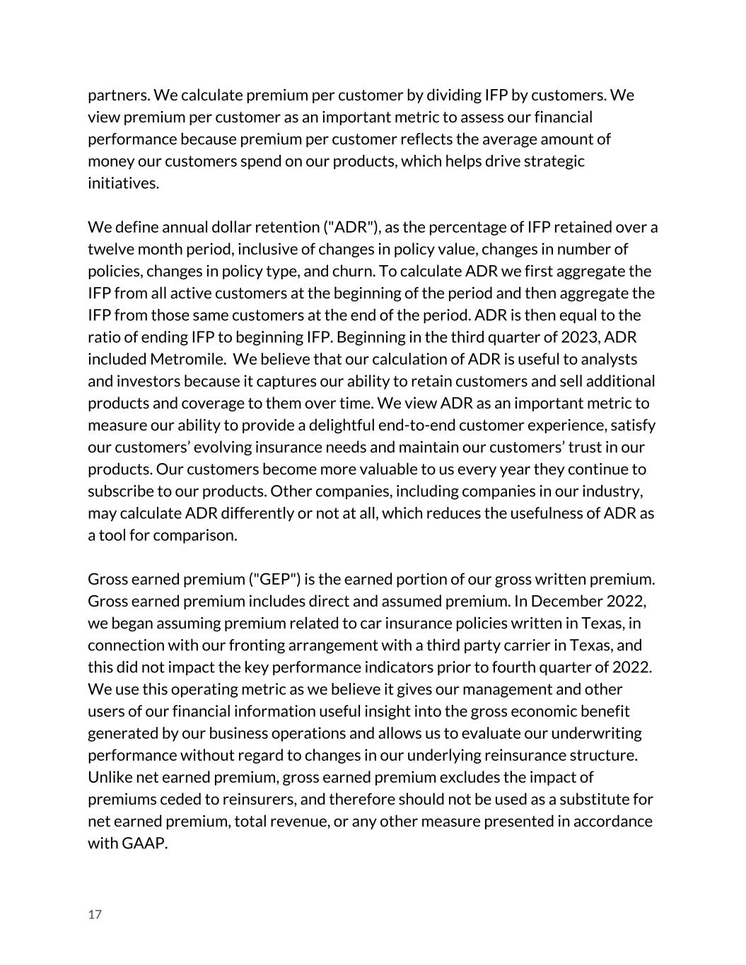 partners. We calculate premium per customer by dividing IFP by customers. We view premium per customer as an important metric to assess our financial performance because premium per customer reflects the average amount of money our customers spend on our products, which helps drive strategic initiatives. We define annual dollar retention ("ADR"), as the percentage of IFP retained over a twelve month period, inclusive of changes in policy value, changes in number of policies, changes in policy type, and churn. To calculate ADR we first aggregate the IFP from all active customers at the beginning of the period and then aggregate the IFP from those same customers at the end of the period. ADR is then equal to the ratio of ending IFP to beginning IFP. Beginning in the third quarter of 2023, ADR included Metromile. We believe that our calculation of ADR is useful to analysts and investors because it captures our ability to retain customers and sell additional products and coverage to them over time. We view ADR as an important metric to measure our ability to provide a delightful end-to-end customer experience, satisfy our customers’ evolving insurance needs and maintain our customers’ trust in our products. Our customers become more valuable to us every year they continue to subscribe to our products. Other companies, including companies in our industry, may calculate ADR differently or not at all, which reduces the usefulness of ADR as a tool for comparison. Gross earned premium ("GEP") is the earned portion of our gross written premium. Gross earned premium includes direct and assumed premium. In December 2022, we began assuming premium related to car insurance policies written in Texas, in connection with our fronting arrangement with a third party carrier in Texas, and this did not impact the key performance indicators prior to fourth quarter of 2022. We use this operating metric as we believe it gives our management and other users of our financial information useful insight into the gross economic benefit generated by our business operations and allows us to evaluate our underwriting performance without regard to changes in our underlying reinsurance structure. Unlike net earned premium, gross earned premium excludes the impact of premiums ceded to reinsurers, and therefore should not be used as a substitute for net earned premium, total revenue, or any other measure presented in accordance with GAAP. 17