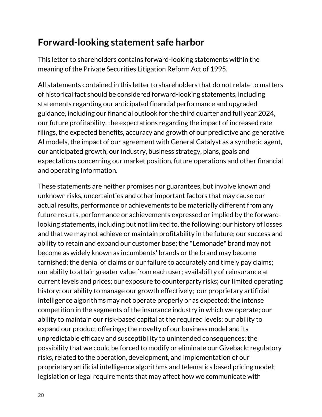 Forward-looking statement safe harbor This letter to shareholders contains forward-looking statements within the meaning of the Private Securities Litigation Reform Act of 1995. All statements contained in this letter to shareholders that do not relate to matters of historical fact should be considered forward-looking statements, including statements regarding our anticipated financial performance and upgraded guidance, including our financial outlook for the third quarter and full year 2024, our future profitability, the expectations regarding the impact of increased rate filings, the expected benefits, accuracy and growth of our predictive and generative AI models, the impact of our agreement with General Catalyst as a synthetic agent, our anticipated growth, our industry, business strategy, plans, goals and expectations concerning our market position, future operations and other financial and operating information. These statements are neither promises nor guarantees, but involve known and unknown risks, uncertainties and other important factors that may cause our actual results, performance or achievements to be materially different from any future results, performance or achievements expressed or implied by the forward- looking statements, including but not limited to, the following: our history of losses and that we may not achieve or maintain profitability in the future; our success and ability to retain and expand our customer base; the "Lemonade" brand may not become as widely known as incumbents' brands or the brand may become tarnished; the denial of claims or our failure to accurately and timely pay claims; our ability to attain greater value from each user; availability of reinsurance at current levels and prices; our exposure to counterparty risks; our limited operating history; our ability to manage our growth effectively; our proprietary artificial intelligence algorithms may not operate properly or as expected; the intense competition in the segments of the insurance industry in which we operate; our ability to maintain our risk-based capital at the required levels; our ability to expand our product offerings; the novelty of our business model and its unpredictable efficacy and susceptibility to unintended consequences; the possibility that we could be forced to modify or eliminate our Giveback; regulatory risks, related to the operation, development, and implementation of our proprietary artificial intelligence algorithms and telematics based pricing model; legislation or legal requirements that may affect how we communicate with 20