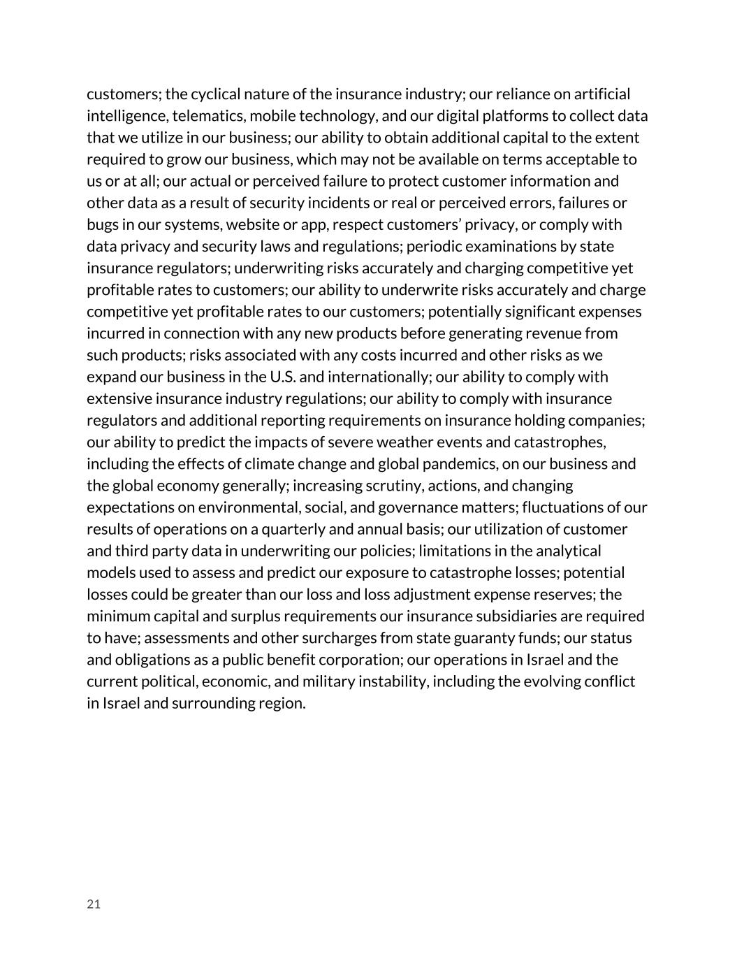 customers; the cyclical nature of the insurance industry; our reliance on artificial intelligence, telematics, mobile technology, and our digital platforms to collect data that we utilize in our business; our ability to obtain additional capital to the extent required to grow our business, which may not be available on terms acceptable to us or at all; our actual or perceived failure to protect customer information and other data as a result of security incidents or real or perceived errors, failures or bugs in our systems, website or app, respect customers’ privacy, or comply with data privacy and security laws and regulations; periodic examinations by state insurance regulators; underwriting risks accurately and charging competitive yet profitable rates to customers; our ability to underwrite risks accurately and charge competitive yet profitable rates to our customers; potentially significant expenses incurred in connection with any new products before generating revenue from such products; risks associated with any costs incurred and other risks as we expand our business in the U.S. and internationally; our ability to comply with extensive insurance industry regulations; our ability to comply with insurance regulators and additional reporting requirements on insurance holding companies; our ability to predict the impacts of severe weather events and catastrophes, including the effects of climate change and global pandemics, on our business and the global economy generally; increasing scrutiny, actions, and changing expectations on environmental, social, and governance matters; fluctuations of our results of operations on a quarterly and annual basis; our utilization of customer and third party data in underwriting our policies; limitations in the analytical models used to assess and predict our exposure to catastrophe losses; potential losses could be greater than our loss and loss adjustment expense reserves; the minimum capital and surplus requirements our insurance subsidiaries are required to have; assessments and other surcharges from state guaranty funds; our status and obligations as a public benefit corporation; our operations in Israel and the current political, economic, and military instability, including the evolving conflict in Israel and surrounding region. 21