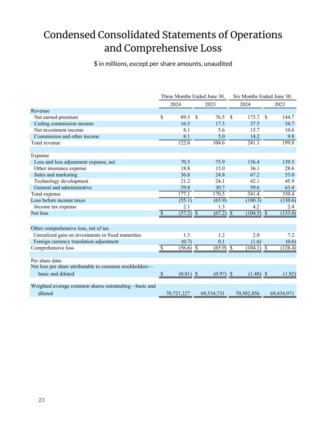 Condensed Consolidated Statements of Operations and Comprehensive Loss $ in millions, except per share amounts, unaudited Three Months Ended June 30, Six Months Ended June 30, 2024 2023 2024 2023 Revenue Net earned premium $ 89.3 $ 76.5 $ 173.7 $ 144.7 Ceding commission income 16.5 17.5 37.5 34.7 Net investment income 8.1 5.6 15.7 10.6 Commission and other income 8.1 5.0 14.2 9.8 Total revenue 122.0 104.6 241.1 199.8 Expense Loss and loss adjustment expense, net 70.5 75.9 136.4 139.5 Other insurance expense 18.8 15.0 36.1 28.6 Sales and marketing 36.8 24.8 67.2 53.0 Technology development 21.2 24.1 42.1 45.9 General and administrative 29.8 30.7 59.6 63.4 Total expense 177.1 170.5 341.4 330.4 Loss before income taxes (55.1) (65.9) (100.3) (130.6) Income tax expense 2.1 1.3 4.2 2.4 Net loss $ (57.2) $ (67.2) $ (104.5) $ (133.0) Other comprehensive loss, net of tax Unrealized gain on investments in fixed maturities 1.3 1.2 2.0 7.2 Foreign currency translation adjustment (0.7) 0.1 (1.6) (0.6) Comprehensive loss $ (56.6) $ (65.9) $ (104.1) $ (126.4) Per share data: Net loss per share attributable to common stockholders— basic and diluted $ (0.81) $ (0.97) $ (1.48) $ (1.92) Weighted average common shares outstanding—basic and diluted 70,721,227 69,534,731 70,502,856 69,434,971 23
