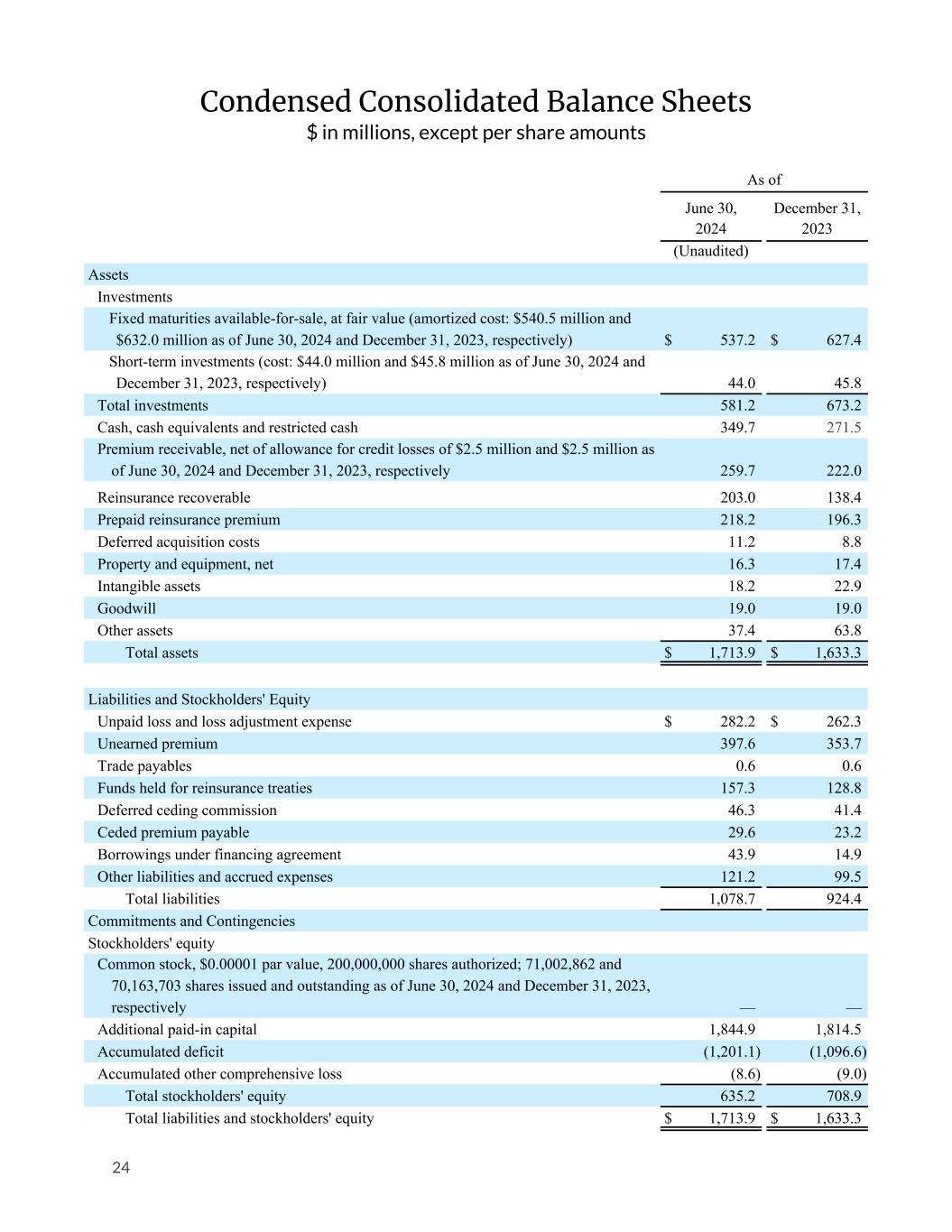 Condensed Consolidated Balance Sheets $ in millions, except per share amounts As of June 30, December 31, 2024 2023 (Unaudited) Assets Investments Fixed maturities available-for-sale, at fair value (amortized cost: $540.5 million and $632.0 million as of June 30, 2024 and December 31, 2023, respectively) $ 537.2 $ 627.4 Short-term investments (cost: $44.0 million and $45.8 million as of June 30, 2024 and December 31, 2023, respectively) 44.0 45.8 Total investments 581.2 673.2 Cash, cash equivalents and restricted cash 349.7 271.5 Premium receivable, net of allowance for credit losses of $2.5 million and $2.5 million as of June 30, 2024 and December 31, 2023, respectively 259.7 222.0 Reinsurance recoverable 203.0 138.4 Prepaid reinsurance premium 218.2 196.3 Deferred acquisition costs 11.2 8.8 Property and equipment, net 16.3 17.4 Intangible assets 18.2 22.9 Goodwill 19.0 19.0 Other assets 37.4 63.8 Total assets $ 1,713.9 $ 1,633.3 Liabilities and Stockholders' Equity Unpaid loss and loss adjustment expense $ 282.2 $ 262.3 Unearned premium 397.6 353.7 Trade payables 0.6 0.6 Funds held for reinsurance treaties 157.3 128.8 Deferred ceding commission 46.3 41.4 Ceded premium payable 29.6 23.2 Borrowings under financing agreement 43.9 14.9 Other liabilities and accrued expenses 121.2 99.5 Total liabilities 1,078.7 924.4 Commitments and Contingencies Stockholders' equity Common stock, $0.00001 par value, 200,000,000 shares authorized; 71,002,862 and 70,163,703 shares issued and outstanding as of June 30, 2024 and December 31, 2023, respectively — — Additional paid-in capital 1,844.9 1,814.5 Accumulated deficit (1,201.1) (1,096.6) Accumulated other comprehensive loss (8.6) (9.0) Total stockholders' equity 635.2 708.9 Total liabilities and stockholders' equity $ 1,713.9 $ 1,633.3 24