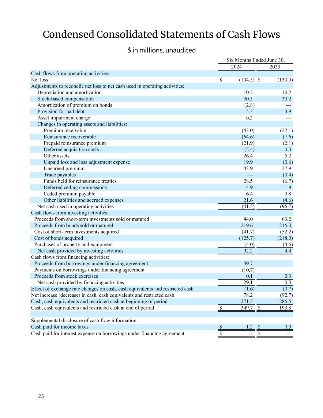 Condensed Consolidated Statements of Cash Flows $ in millions, unaudited Six Months Ended June 30, 2024 2023 Cash flows from operating activities: Net loss $ (104.5) $ (133.0) Adjustments to reconcile net loss to net cash used in operating activities: Depreciation and amortization 10.2 10.2 Stock-based compensation 30.3 30.2 Amortization of premium on bonds (2.8) — Provision for bad debt 5.3 3.9 Asset impairment charge 0.3 — Changes in operating assets and liabilities: Premium receivable (43.0) (22.1) Reinsurance recoverable (64.6) (7.6) Prepaid reinsurance premium (21.9) (2.1) Deferred acquisition costs (2.4) 0.3 Other assets 26.4 5.2 Unpaid loss and loss adjustment expense 19.9 (0.6) Unearned premium 43.9 27.9 Trade payables — (0.4) Funds held for reinsurance treaties 28.5 (6.7) Deferred ceding commissions 4.9 1.9 Ceded premium payable 6.4 0.8 Other liabilities and accrued expenses 21.6 (4.6) Net cash used in operating activities (41.5) (96.7) Cash flows from investing activities: Proceeds from short-term investments sold or matured 44.0 63.2 Proceeds from bonds sold or matured 219.6 216.0 Cost of short-term investments acquired (41.7) (52.2) Cost of bonds acquired (125.7) (218.0) Purchases of property and equipment (4.0) (4.6) Net cash provided by investing activities 92.2 4.4 Cash flows from financing activities: Proceeds from borrowings under financing agreement 39.7 — Payments on borrowings under financing agreement (10.7) — Proceeds from stock exercises 0.1 0.3 Net cash provided by financing activities 29.1 0.3 Effect of exchange rate changes on cash, cash equivalents and restricted cash (1.6) (0.7) Net increase (decrease) in cash, cash equivalents and restricted cash 78.2 (92.7) Cash, cash equivalents and restricted cash at beginning of period 271.5 286.5 Cash, cash equivalents and restricted cash at end of period $ 349.7 $ 193.8 Supplemental disclosure of cash flow information: Cash paid for income taxes $ 1.2 $ 0.3 Cash paid for interest expense on borrowings under financing agreement $ 1.3 $ — 25