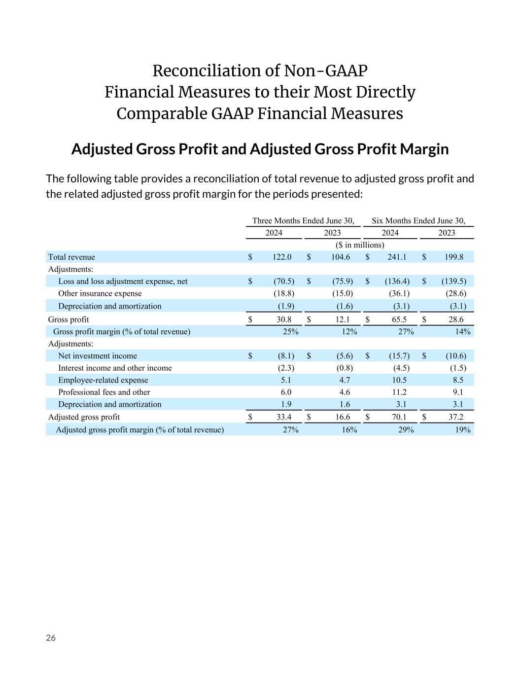 Reconciliation of Non-GAAP Financial Measures to their Most Directly Comparable GAAP Financial Measures Adjusted Gross Profit and Adjusted Gross Profit Margin The following table provides a reconciliation of total revenue to adjusted gross profit and the related adjusted gross profit margin for the periods presented: Three Months Ended June 30, Six Months Ended June 30, 2024 2023 2024 2023 ($ in millions) Total revenue $ 122.0 $ 104.6 $ 241.1 $ 199.8 Adjustments: Loss and loss adjustment expense, net $ (70.5) $ (75.9) $ (136.4) $ (139.5) Other insurance expense (18.8) (15.0) (36.1) (28.6) Depreciation and amortization (1.9) (1.6) (3.1) (3.1) Gross profit $ 30.8 $ 12.1 $ 65.5 $ 28.6 Gross profit margin (% of total revenue) 25% 12% 27% 14% Adjustments: Net investment income $ (8.1) $ (5.6) $ (15.7) $ (10.6) Interest income and other income (2.3) (0.8) (4.5) (1.5) Employee-related expense 5.1 4.7 10.5 8.5 Professional fees and other 6.0 4.6 11.2 9.1 Depreciation and amortization 1.9 1.6 3.1 3.1 Adjusted gross profit $ 33.4 $ 16.6 $ 70.1 $ 37.2 Adjusted gross profit margin (% of total revenue) 27% 16% 29% 19% 26