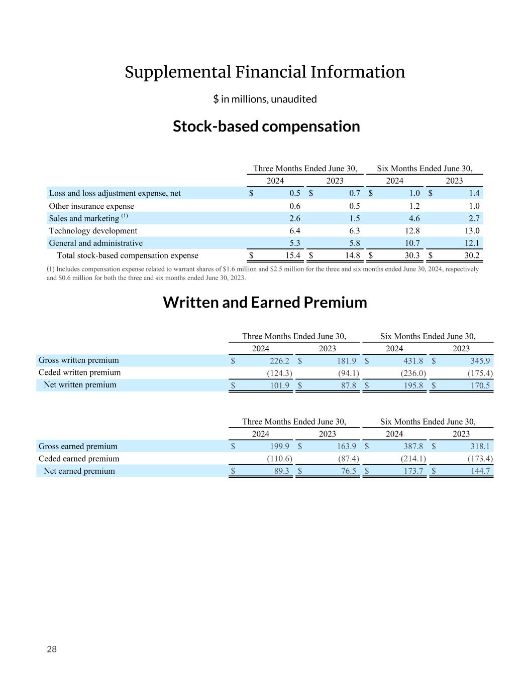 Supplemental Financial Information $ in millions, unaudited Stock-based compensation Three Months Ended June 30, Six Months Ended June 30, 2024 2023 2024 2023 Loss and loss adjustment expense, net $ 0.5 $ 0.7 $ 1.0 $ 1.4 Other insurance expense 0.6 0.5 1.2 1.0 Sales and marketing (1) 2.6 1.5 4.6 2.7 Technology development 6.4 6.3 12.8 13.0 General and administrative 5.3 5.8 10.7 12.1 Total stock-based compensation expense $ 15.4 $ 14.8 $ 30.3 $ 30.2 (1) Includes compensation expense related to warrant shares of $1.6 million and $2.5 million for the three and six months ended June 30, 2024, respectively and $0.6 million for both the three and six months ended June 30, 2023. Written and Earned Premium Three Months Ended June 30, Six Months Ended June 30, 2024 2023 2024 2023 Gross written premium $ 226.2 $ 181.9 $ 431.8 $ 345.9 Ceded written premium (124.3) (94.1) (236.0) (175.4) Net written premium $ 101.9 $ 87.8 $ 195.8 $ 170.5 Three Months Ended June 30, Six Months Ended June 30, 2024 2023 2024 2023 Gross earned premium $ 199.9 $ 163.9 $ 387.8 $ 318.1 Ceded earned premium (110.6) (87.4) (214.1) (173.4) Net earned premium $ 89.3 $ 76.5 $ 173.7 $ 144.7 28