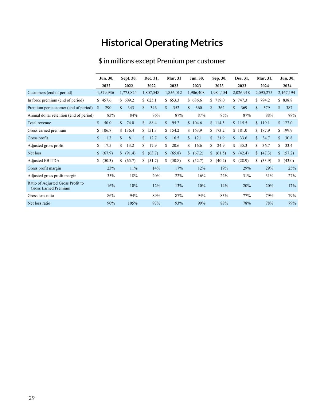 Historical Operating Metrics $ in millions except Premium per customer Jun. 30, Sept. 30, Dec. 31, Mar. 31 Jun. 30, Sep. 30, Dec. 31, Mar. 31, Jun. 30, 2022 2022 2022 2023 2023 2023 2023 2024 2024 Customers (end of period) 1,579,936 1,775,824 1,807,548 1,856,012 1,906,408 1,984,154 2,026,918 2,095,275 2,167,194 In force premium (end of period) $ 457.6 $ 609.2 $ 625.1 $ 653.3 $ 686.6 $ 719.0 $ 747.3 $ 794.2 $ 838.8 Premium per customer (end of period) $ 290 $ 343 $ 346 $ 352 $ 360 $ 362 $ 369 $ 379 $ 387 Annual dollar retention (end of period) 83% 84% 86% 87% 87% 85% 87% 88% 88% Total revenue $ 50.0 $ 74.0 $ 88.4 $ 95.2 $ 104.6 $ 114.5 $ 115.5 $ 119.1 $ 122.0 Gross earned premium $ 106.8 $ 136.4 $ 151.3 $ 154.2 $ 163.9 $ 173.2 $ 181.0 $ 187.9 $ 199.9 Gross profit $ 11.3 $ 8.1 $ 12.7 $ 16.5 $ 12.1 $ 21.9 $ 33.6 $ 34.7 $ 30.8 Adjusted gross profit $ 17.5 $ 13.2 $ 17.9 $ 20.6 $ 16.6 $ 24.9 $ 35.3 $ 36.7 $ 33.4 Net loss $ (67.9) $ (91.4) $ (63.7) $ (65.8) $ (67.2) $ (61.5) $ (42.4) $ (47.3) $ (57.2) Adjusted EBITDA $ (50.3) $ (65.7) $ (51.7) $ (50.8) $ (52.7) $ (40.2) $ (28.9) $ (33.9) $ (43.0) Gross profit margin 23% 11% 14% 17% 12% 19% 29% 29% 25% Adjusted gross profit margin 35% 18% 20% 22% 16% 22% 31% 31% 27% Ratio of Adjusted Gross Profit to Gross Earned Premium 16% 10% 12% 13% 10% 14% 20% 20% 17% Gross loss ratio 86% 94% 89% 87% 94% 83% 77% 79% 79% Net loss ratio 90% 105% 97% 93% 99% 88% 78% 78% 79% 29