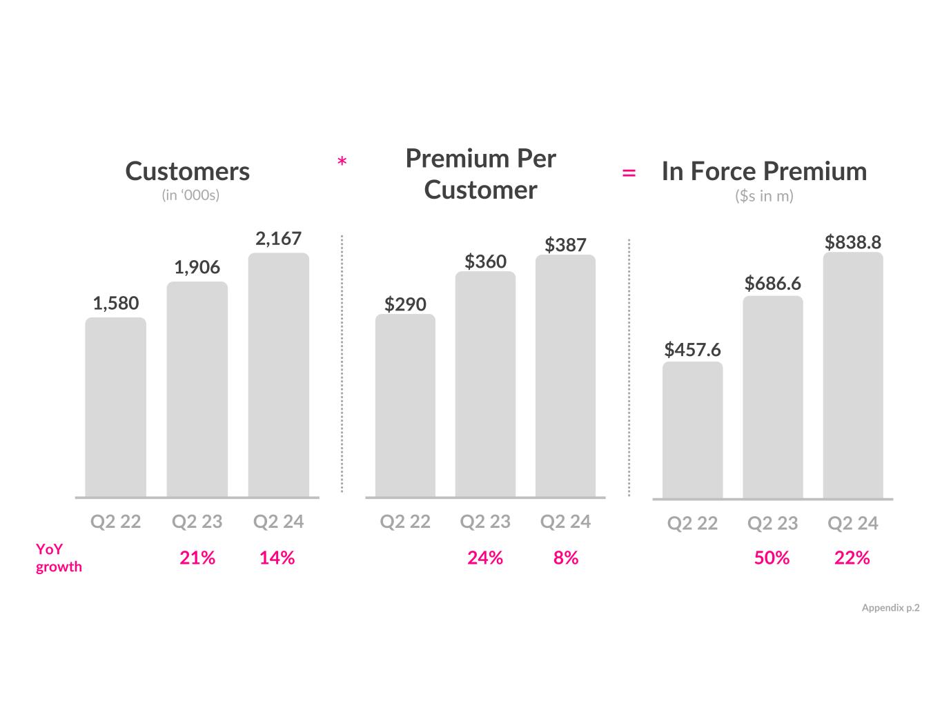 Customers (in ‘000s) In Force Premium ($s in m) 14% 21% YoY growth 22%50% 1,580 1,906 2,167 Q2 22 Q2 23 Q2 24 $457.6 $686.6 $838.8 Q2 22 Q2 23 Q2 24 $290 $360 $387 Q2 22 Q2 23 Q2 24 Premium Per Customer 8% 24% * = Appendix p.2