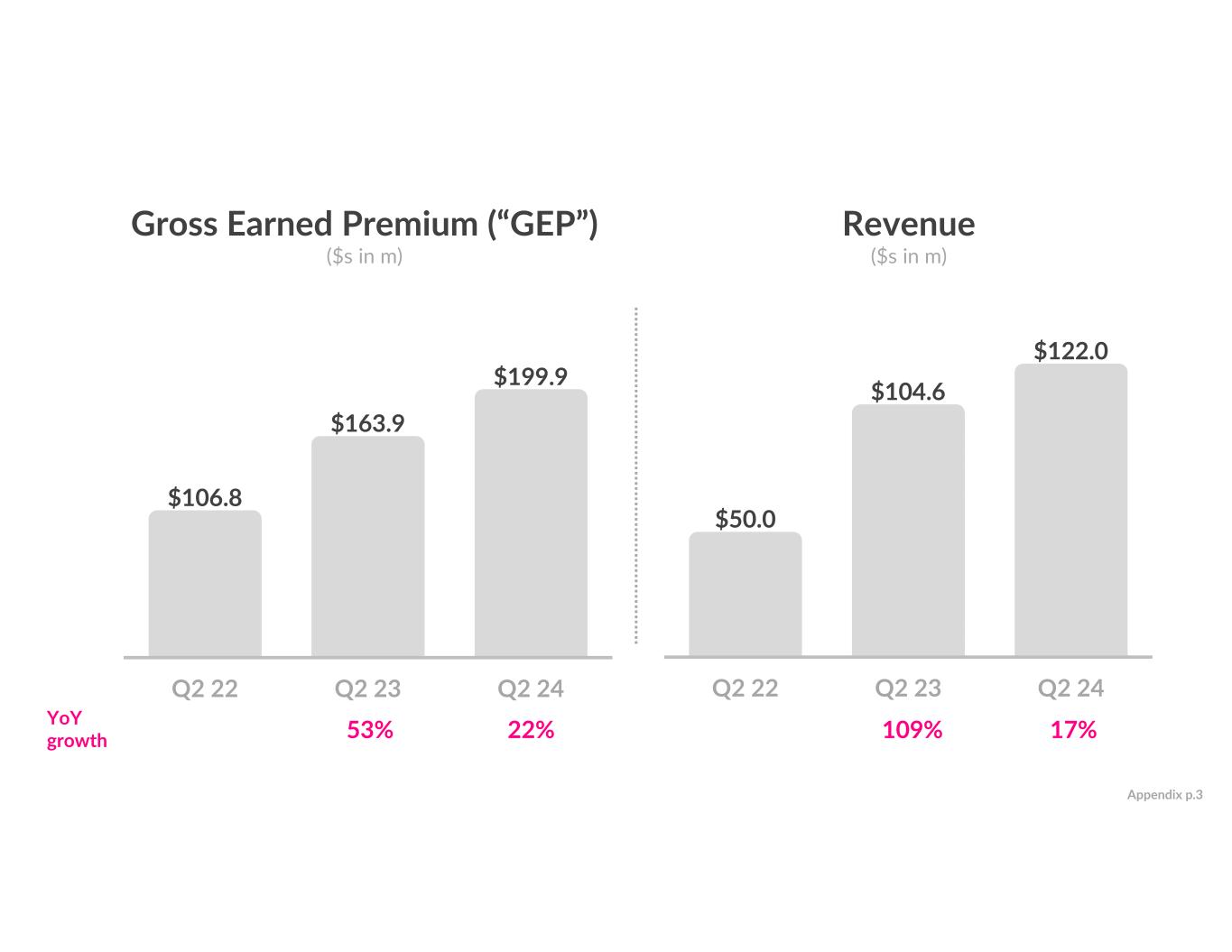 Gross Earned Premium (“GEP”) ($s in m) Revenue ($s in m) $50.0 $104.6 $122.0 Q2 22 Q2 23 Q2 24 17%109%YoY growth $106.8 $163.9 $199.9 Q2 22 Q2 23 Q2 24 22% 53% Appendix p.3