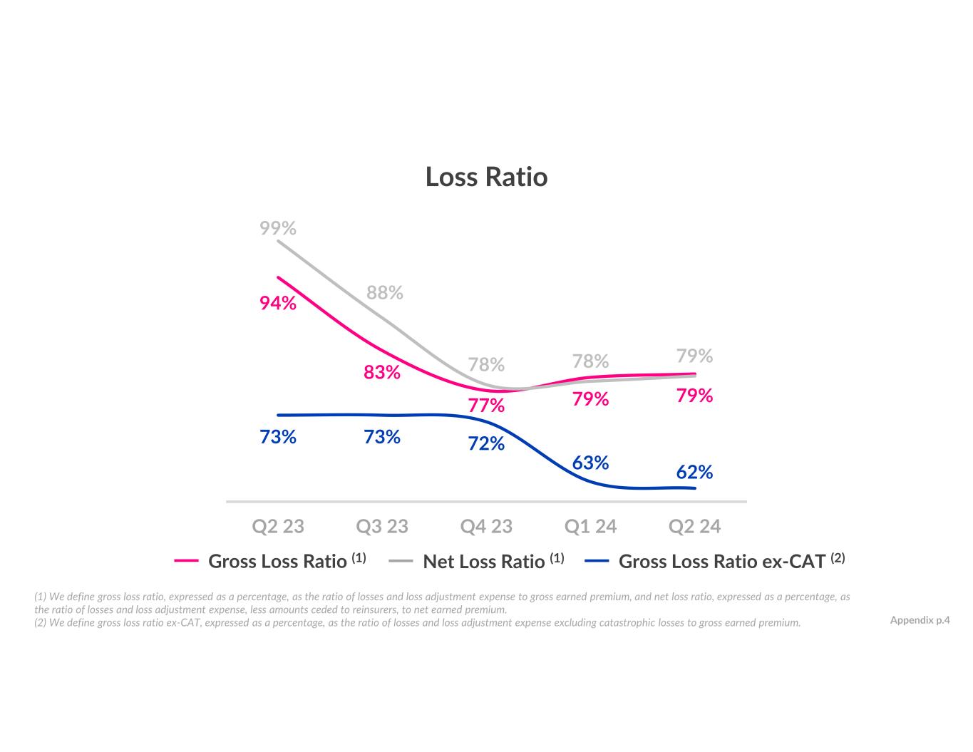 Dear Shareholders, Our second quarter results were excellent, headlined by robust topline growth, relative stability in expenses, and we were net cash flow ("NCF") positive. We also wanted to highlight our upcoming Investor Day, to be held on November 19, 2024, in New York City, where we'll provide detailed updates on our strategic expansion plans, operating efficiencies, and growth trajectory. We hope to see you there! Here’s a quick look at our operating metrics: • Net Cash Flow: We were NCF positive in Q2 2024 and expect to remain NCF positive with the exception of Q4 2024. • Top Line: At $839 million, In Force Premium grew 22% YoY, while revenue grew 17%. • Gross Loss Ratio: At 79%, gross loss ratio improved a notable 15 points year on year, while trailing twelve months ("TTM") gross loss ratio was also 79%, 12 points improved vs prior year, and 4 points improved sequentially. • Gross Profit: Increased by 155% year on year, while our Gross Profit Margin doubled year on year to 25%. • Operating Expense: Increased 13% or $12 million year on year, primarily driven by a $13 million increase in growth spend, while all other operating expense was stable as compared to prior year. • Bottom line: At ($43) million, Adjusted EBITDA loss improved 18% year on year, while Net Loss, at ($57) million, improved 15%. 3