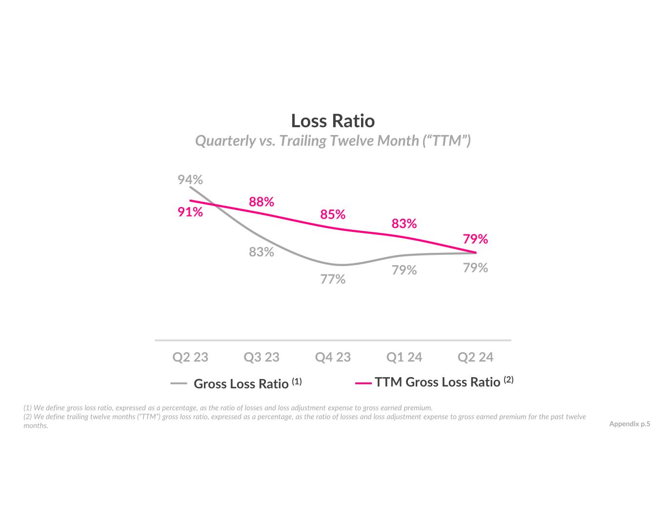 94% 83% 77% 79% 79% 99% 88% 78% 78% 79% 73% 73% 72% 63% 62% Q2 23 Q3 23 Q4 23 Q1 24 Q2 24 Loss Ratio Gross Loss Ratio (1) Net Loss Ratio (1) (1) We define gross loss ratio, expressed as a percentage, as the ratio of losses and loss adjustment expense to gross earned premium, and net loss ratio, expressed as a percentage, as the ratio of losses and loss adjustment expense, less amounts ceded to reinsurers, to net earned premium. (2) We define gross loss ratio ex-CAT, expressed as a percentage, as the ratio of losses and loss adjustment expense excluding catastrophic losses to gross earned premium. Appendix p.4 Gross Loss Ratio ex-CAT (2)