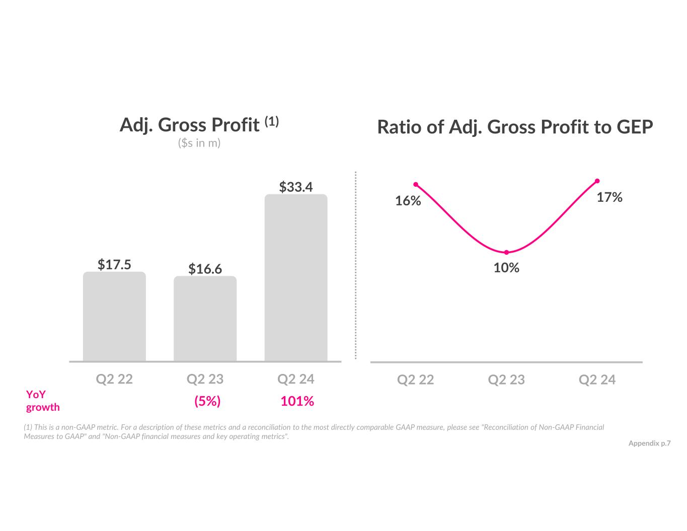 Adj. Gross Profit (1) ($s in m) Ratio of Adj. Gross Profit to GEP $17.5 $16.6 $33.4 Q2 22 Q2 23 Q2 24 101%(5%) (1) This is a non-GAAP metric. For a description of these metrics and a reconciliation to the most directly comparable GAAP measure, please see "Reconciliation of Non-GAAP Financial Measures to GAAP" and "Non-GAAP financial measures and key operating metrics". 16% 10% 17% Q2 22 Q2 23 Q2 24 YoY growth Appendix p.7