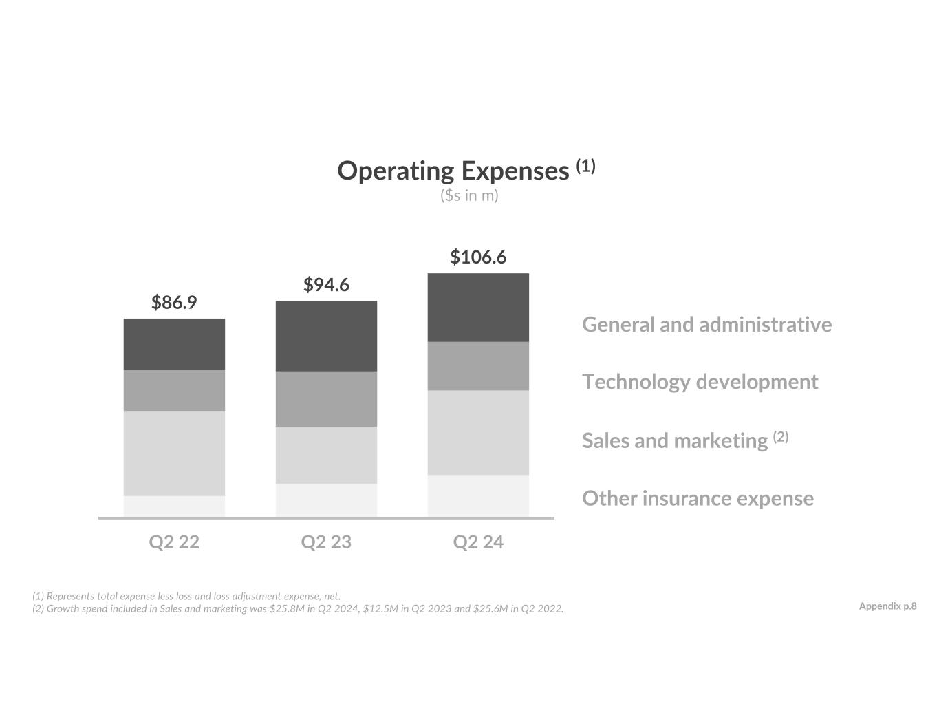 $86.9 $94.6 $106.6 Q2 22 Q2 23 Q2 24 Other insurance expense Sales and marketing (2) Technology development General and administrative Operating Expenses (1) ($s in m) (1) Represents total expense less loss and loss adjustment expense, net. (2) Growth spend included in Sales and marketing was $25.8M in Q2 2024, $12.5M in Q2 2023 and $25.6M in Q2 2022. Appendix p.8