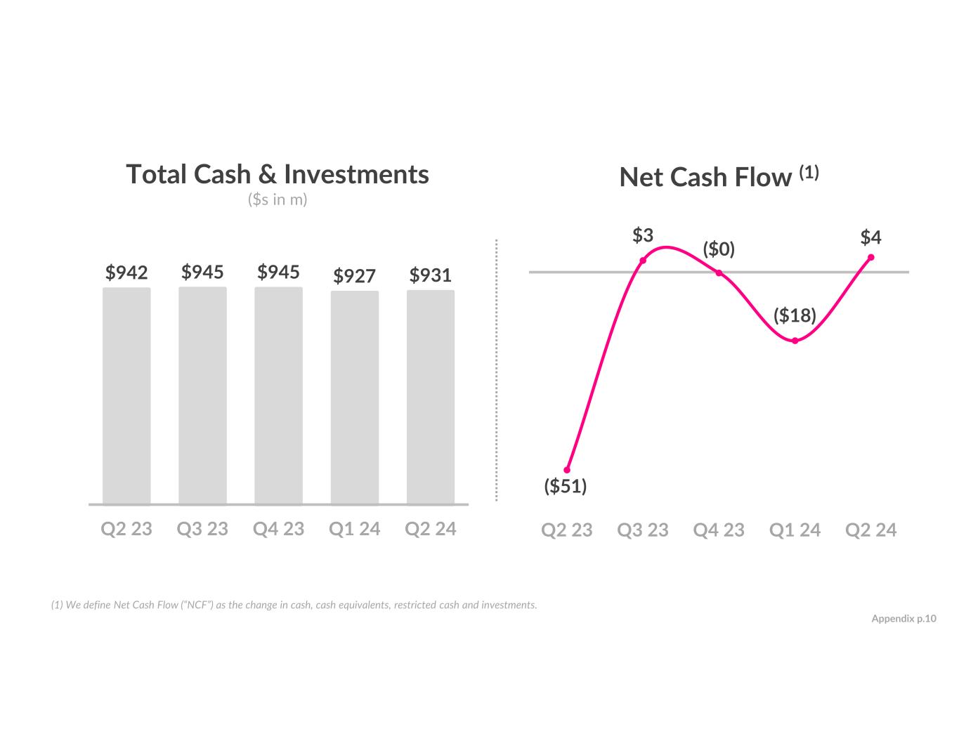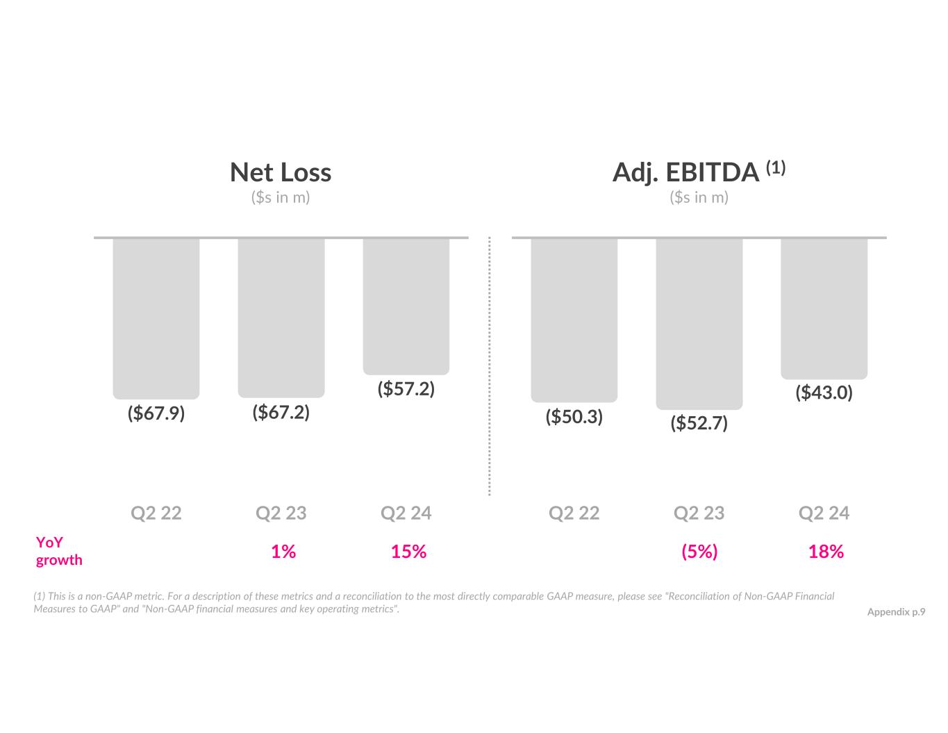 Net Loss ($s in m) Adj. EBITDA (1) ($s in m) 18%(5%) YoY growth 15% 1% (1) This is a non-GAAP metric. For a description of these metrics and a reconciliation to the most directly comparable GAAP measure, please see "Reconciliation of Non-GAAP Financial Measures to GAAP" and "Non-GAAP financial measures and key operating metrics". Appendix p.9 ($67.9) ($67.2) ($57.2) Q2 22 Q2 23 Q2 24 ($50.3) ($52.7) ($43.0) Q2 22 Q2 23 Q2 24