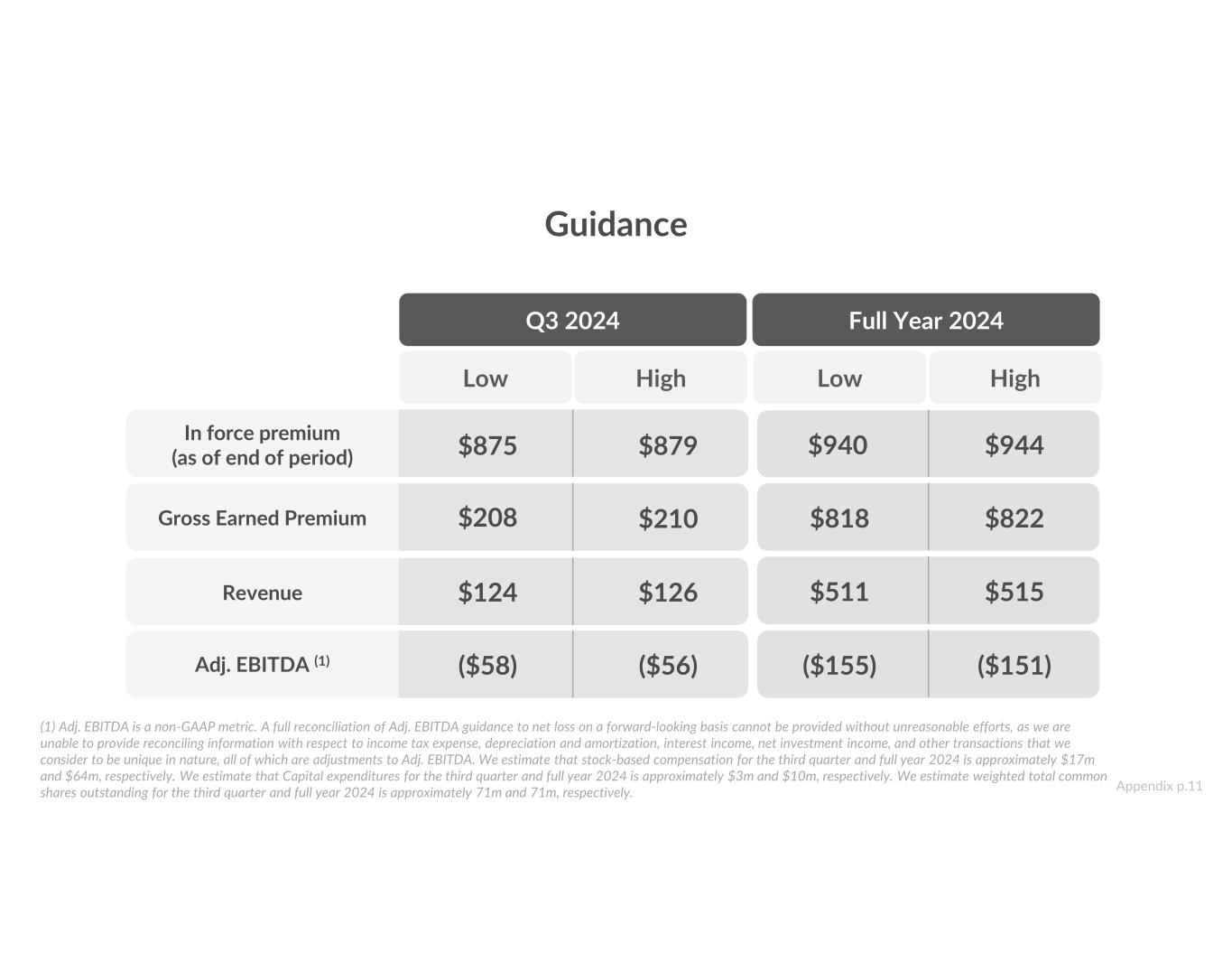 Guidance ($s in m)Q3 2024 Full Year 2024 $875 $879 $208 $210 $124 $126 ($58) ($56) ($155) ($151) $511 $515 $818 $822 $940 $944 Low High Low High In force premium (as of end of period) Gross Earned Premium Revenue Adj. EBITDA (1) (1) Adj. EBITDA is a non-GAAP metric. A full reconciliation of Adj. EBITDA guidance to net loss on a forward-looking basis cannot be provided without unreasonable efforts, as we are unable to provide reconciling information with respect to income tax expense, depreciation and amortization, interest income, net investment income, and other transactions that we consider to be unique in nature, all of which are adjustments to Adj. EBITDA. We estimate that stock-based compensation for the third quarter and full year 2024 is approximately $17m and $64m, respectively. We estimate that Capital expenditures for the third quarter and full year 2024 is approximately $3m and $10m, respectively. We estimate weighted total common shares outstanding for the third quarter and full year 2024 is approximately 71m and 71m, respectively. Appendix p.11