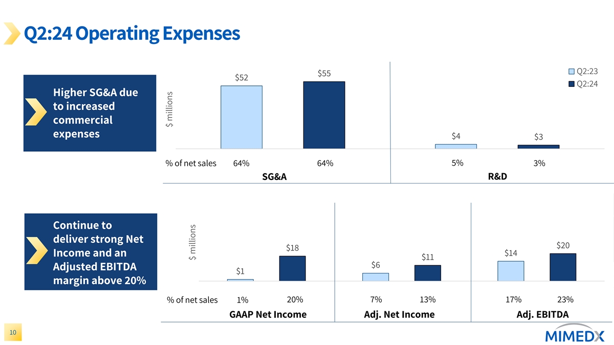 Q2:24 Gross Profit & Gross Margin Roughly Flat Year/Year 80 $72 $68 Q2:24 GAAP gross profit and gross margin impacted by HELIOGEN transaction-related accounting, 83% excluding this $0.4 million impact, 83% gross margins were flat 0 Q2:23 Q2:24 9 $ millions Gross Margin