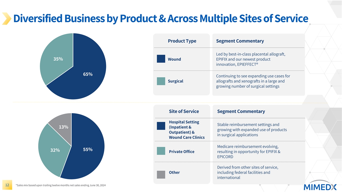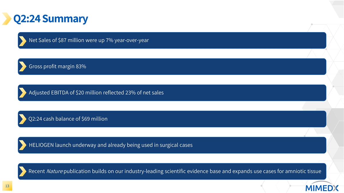 Diversified Business by Product & Across Multiple Sites of Service Product Type Segment Commentary Led by best-in-class placental allograft, 35% Wound EPIFIX and our newest product innovation, EPIEFFECT® 65% Continuing to see expanding use cases for Surgical allografts and xenografts in a large and growing number of surgical settings Site of Service Segment Commentary Hospital Setting Stable reimbursement settings and 13% (Inpatient & growing with expanded use of products Outpatient) & in surgical applications Wound Care Clinics Medicare reimbursement evolving, 55% 32% Private Office resulting in opportunity for EPIFIX & EPICORD Derived from other sites of service, Other including federal facilities and international 12 *Sales mix based upon trailing twelve months net sales ending June 30, 2024